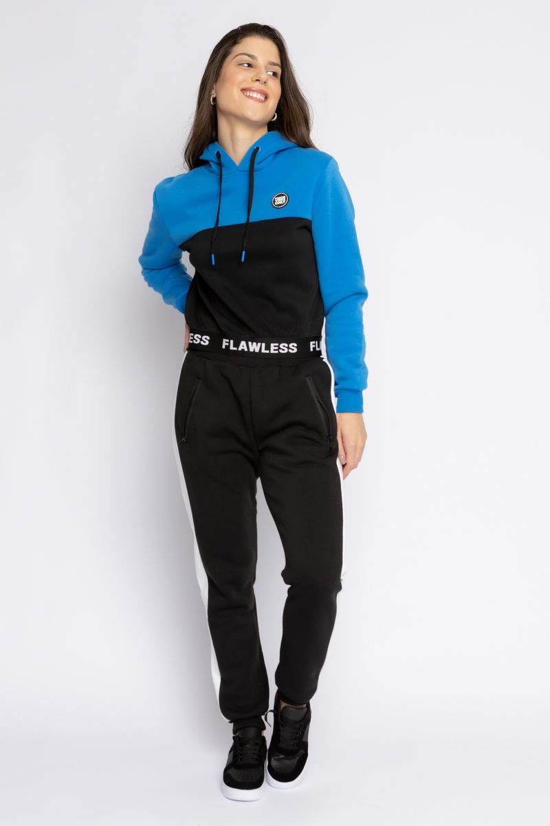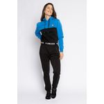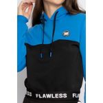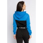 Blusão feminino confeccionado em moletom. A peça possui capuz, manga longa e recortes nas cores azul e preto.