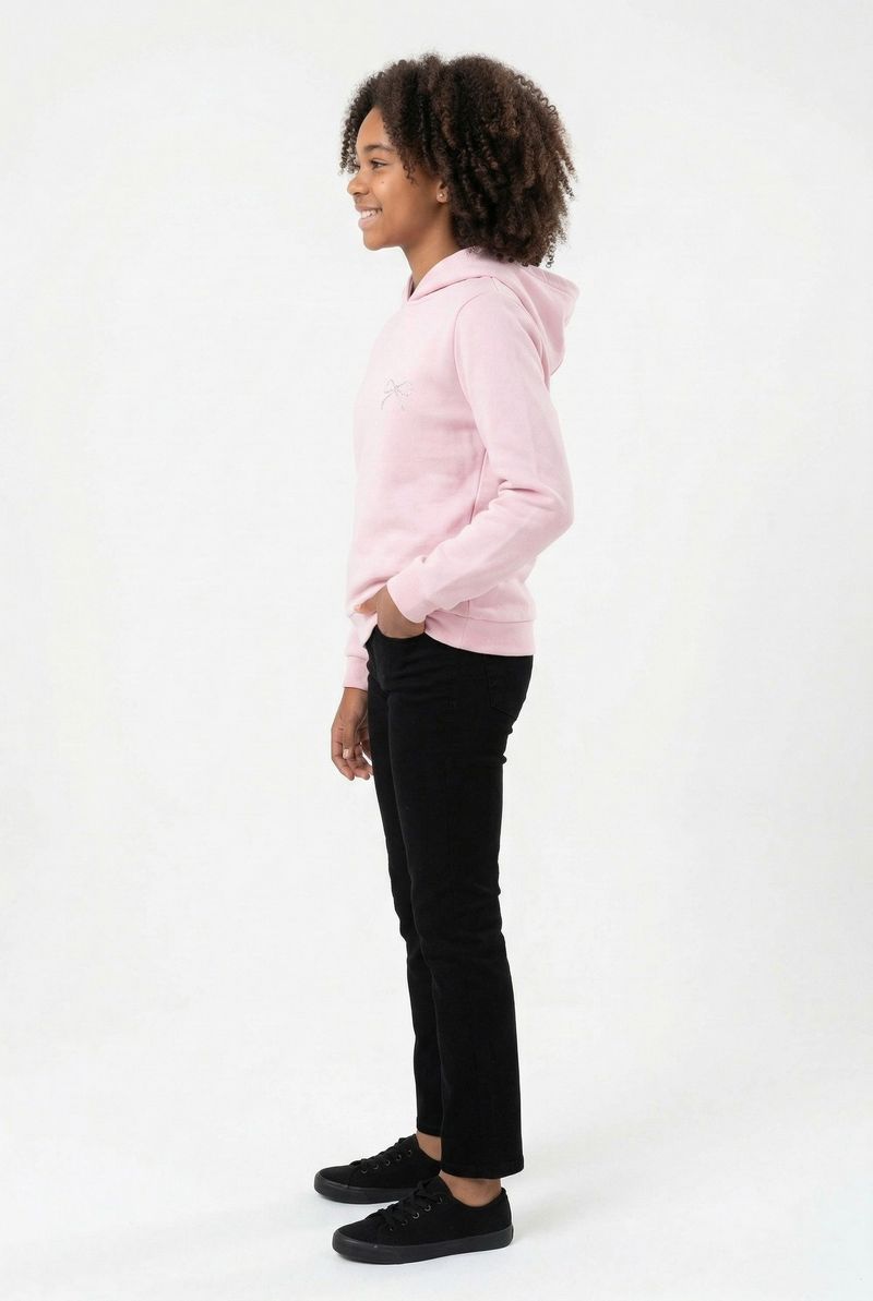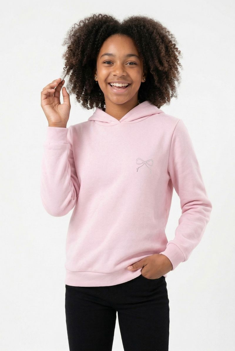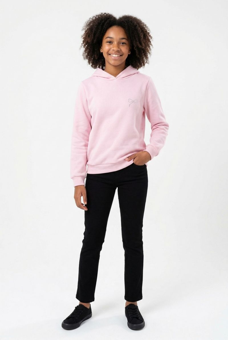 O Moletom Juvenil Rosa com Capuz e Laço Delicado Caedu oferece conforto e estilo para as meninas. Feito em moletom com felpa, possui capuz, mangas longas com punhos canelados e um charmoso laço brilhante no peito. Perfeito para compor looks de moda com as roupas Caedu.
