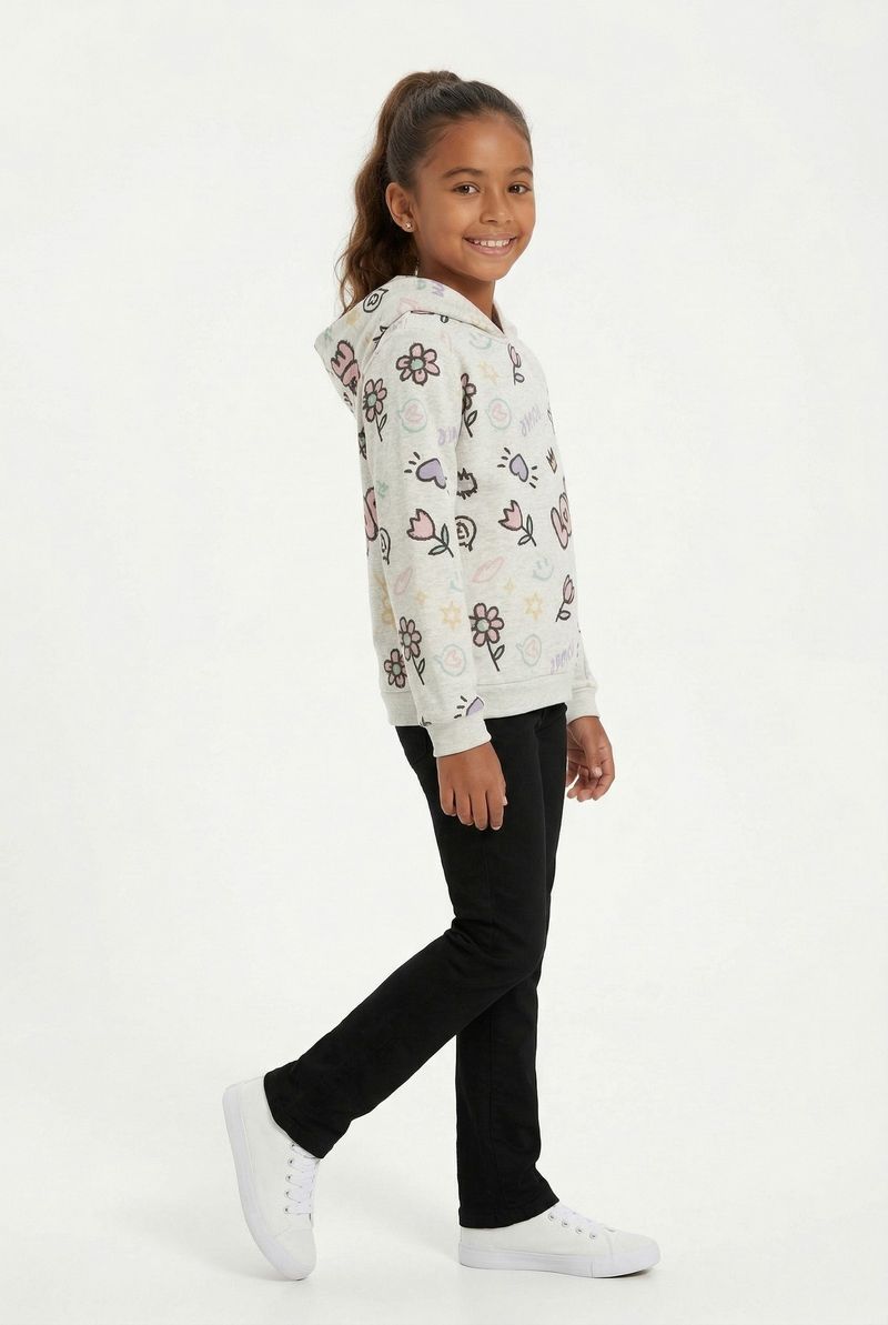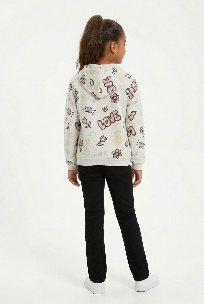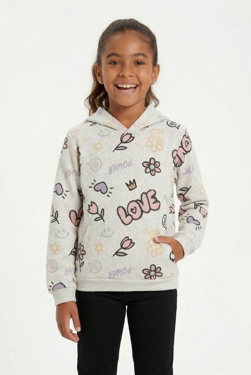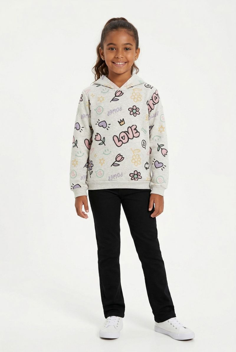 O Moletom Juvenil Feminino Caedu, em moletom com felpa 100% poliéster, oferece conforto e maciez. Sua estampa vibrante 'Love & Power' e emojis coloridos, com capuz, garantem um visual alegre e cheio de estilo.