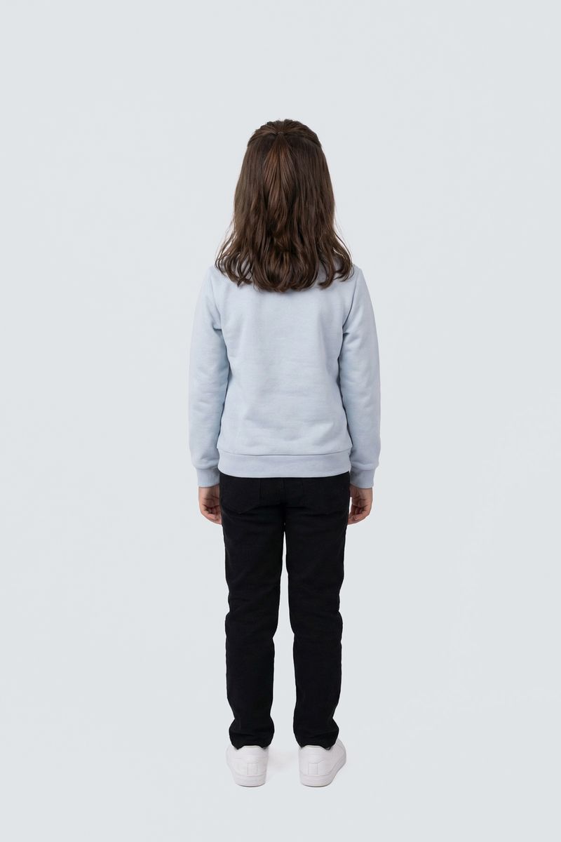 Combine o moletom azul claro com calças jeans ou leggings pretas para um look casual e confortável. Para os pés, tênis brancos ou coloridos complementam o visual com um toque divertido. Em dias mais frescos, uma jaqueta leve por cima adiciona estilo e proteção, criando um conjunto versátil e cheio de personalidade.