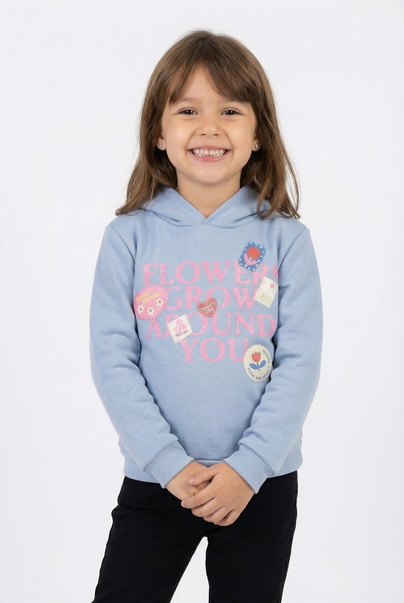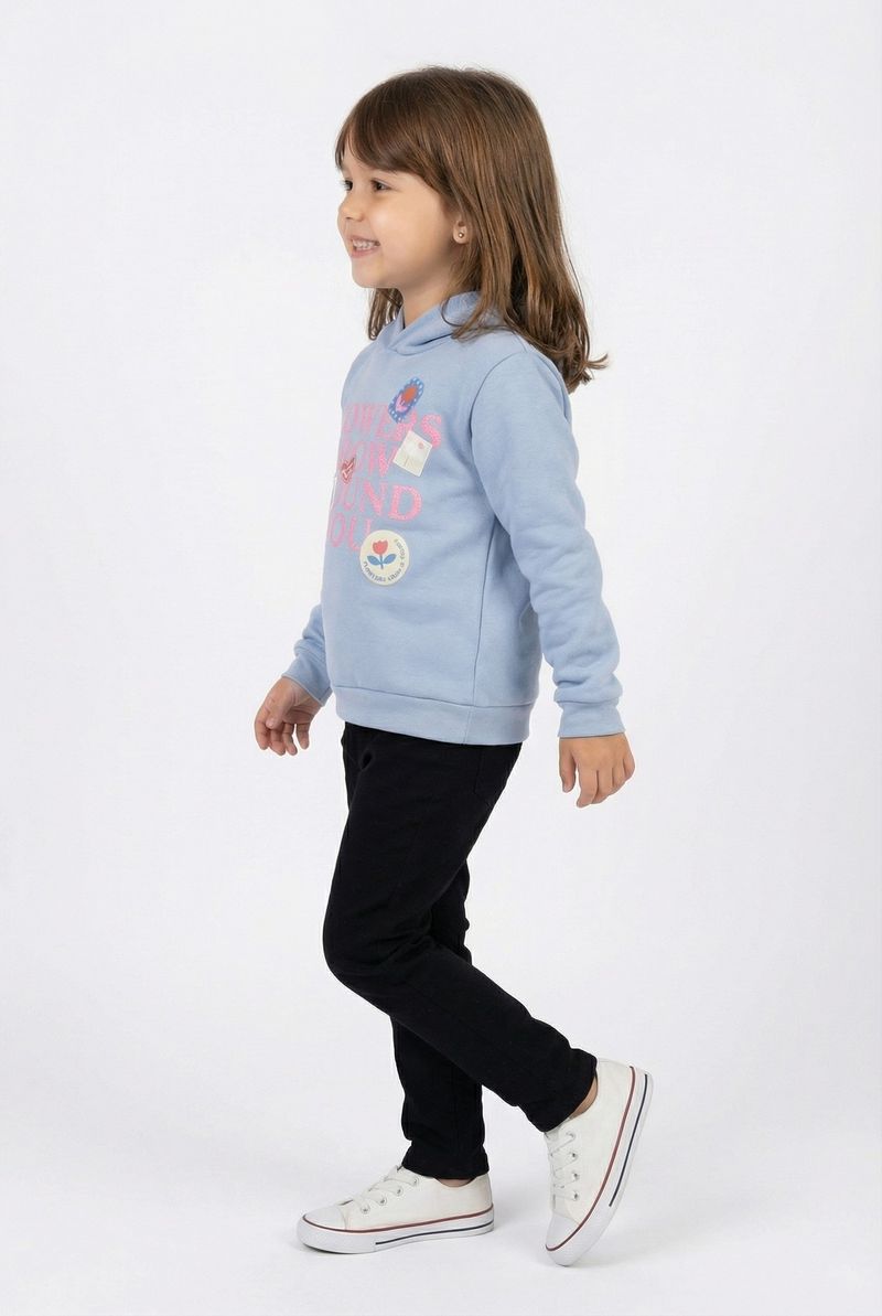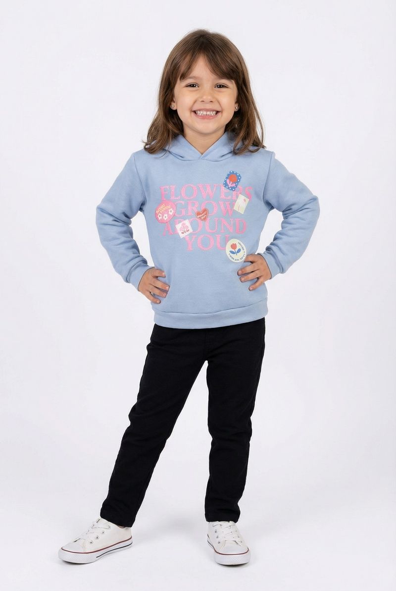 O Moletom Infantil Caedu é a roupa infantil ideal para conforto e estilo. Em azul claro com capuz, destaca a estampa 'FLOWERS GROW AROUND YOU', transmitindo uma mensagem positiva. Feito em moletom com felpa, garante maciez e um visual moderno.