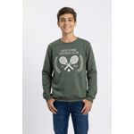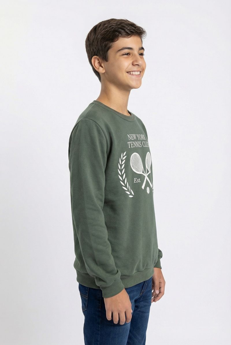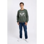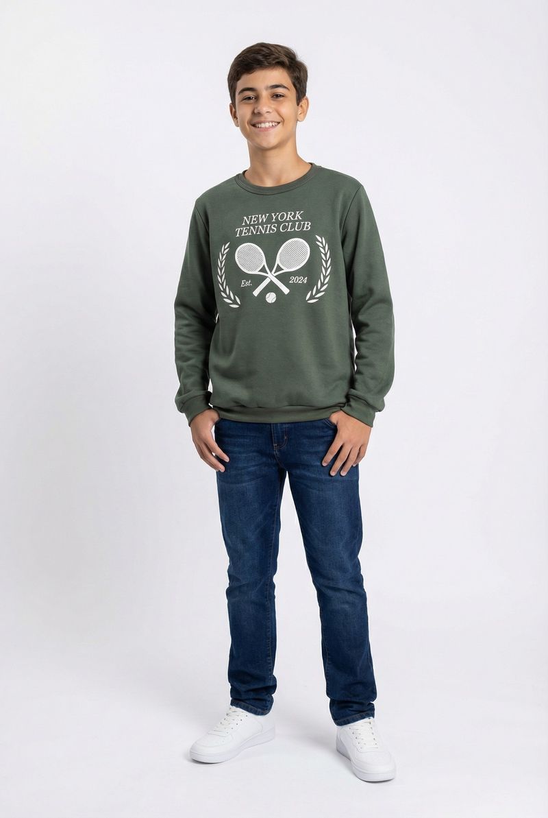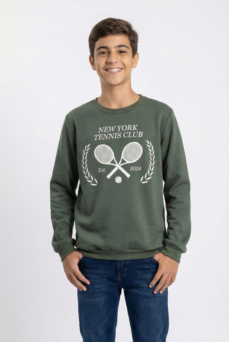 Sinta a energia da cidade com o Moletom Juvenil Caedu Verde Militar. Confeccionado em moletom com felpa 100% poliéster, oferece conforto e durabilidade. Sua estampa exclusiva "New York Tennis Club" adiciona um toque esportivo e moderno ao visual, perfeito para os jovens que amam moda e estilo.