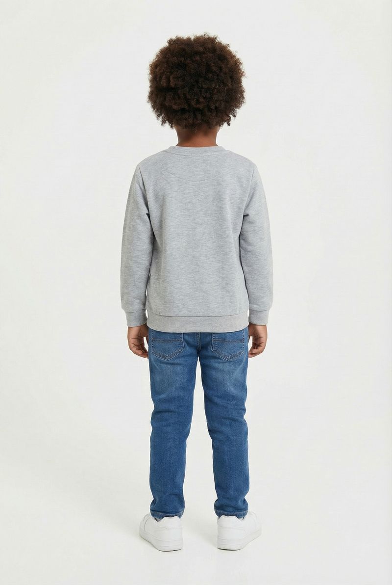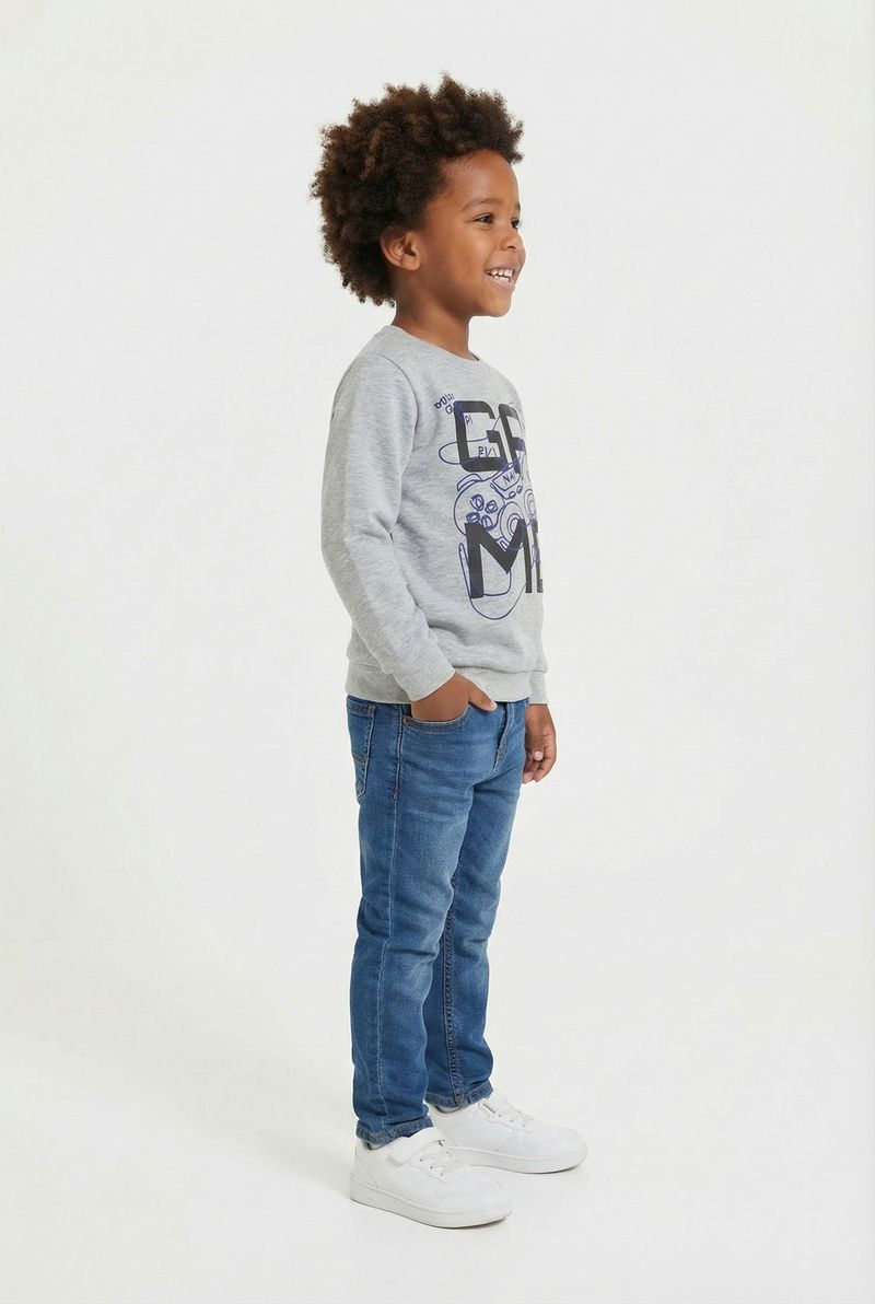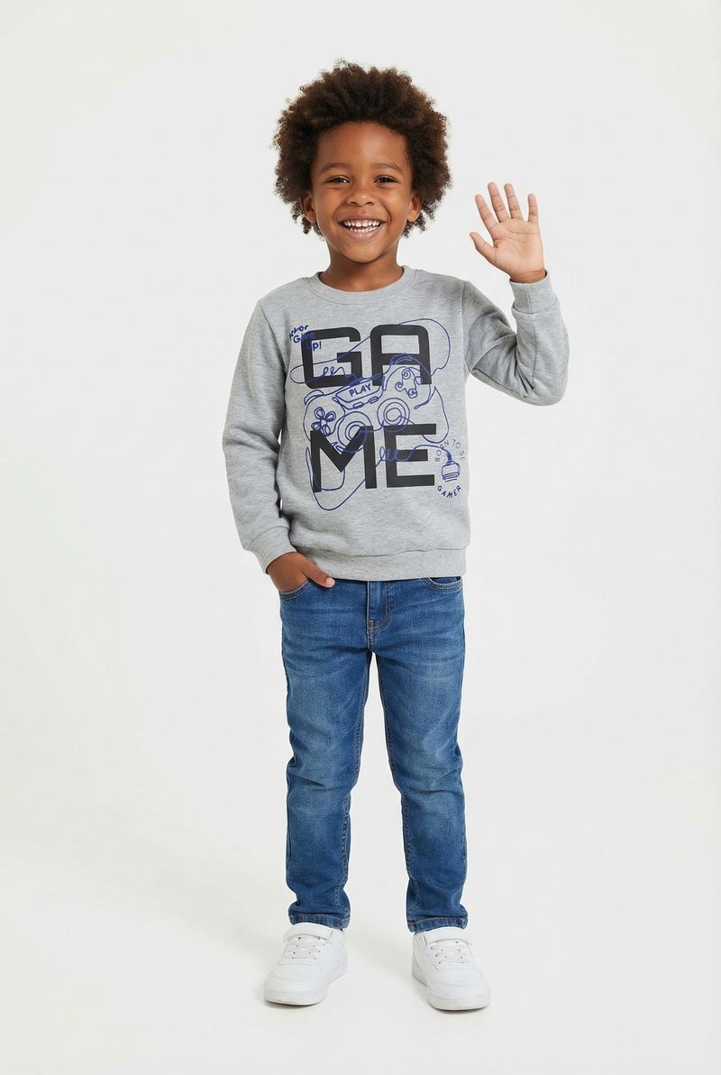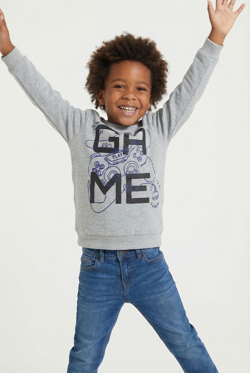 O Moletom Infantil Gamer Cinza Caedu, da nova coleção outono-inverno, é ideal para a diversão. Com estampa de controle de videogame e a palavra 'GAME', este moletom 100% poliéster oferece conforto e estilo para os pequenos.