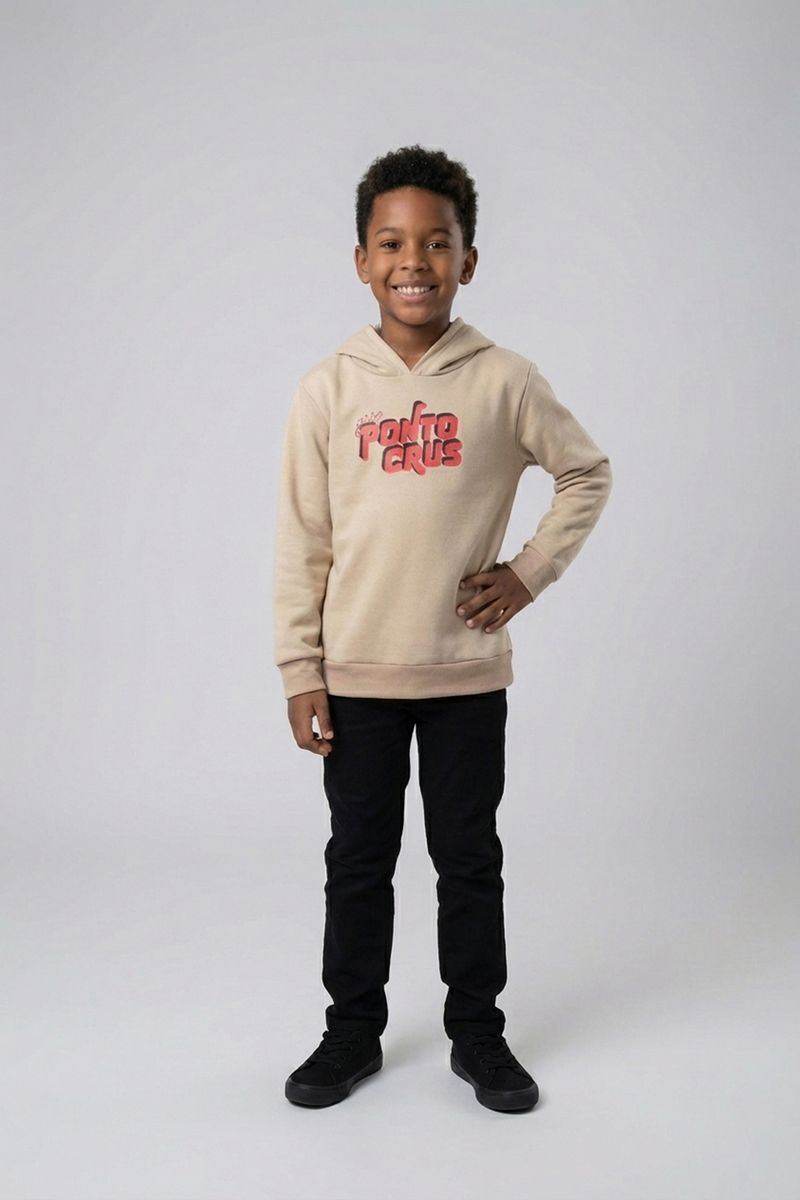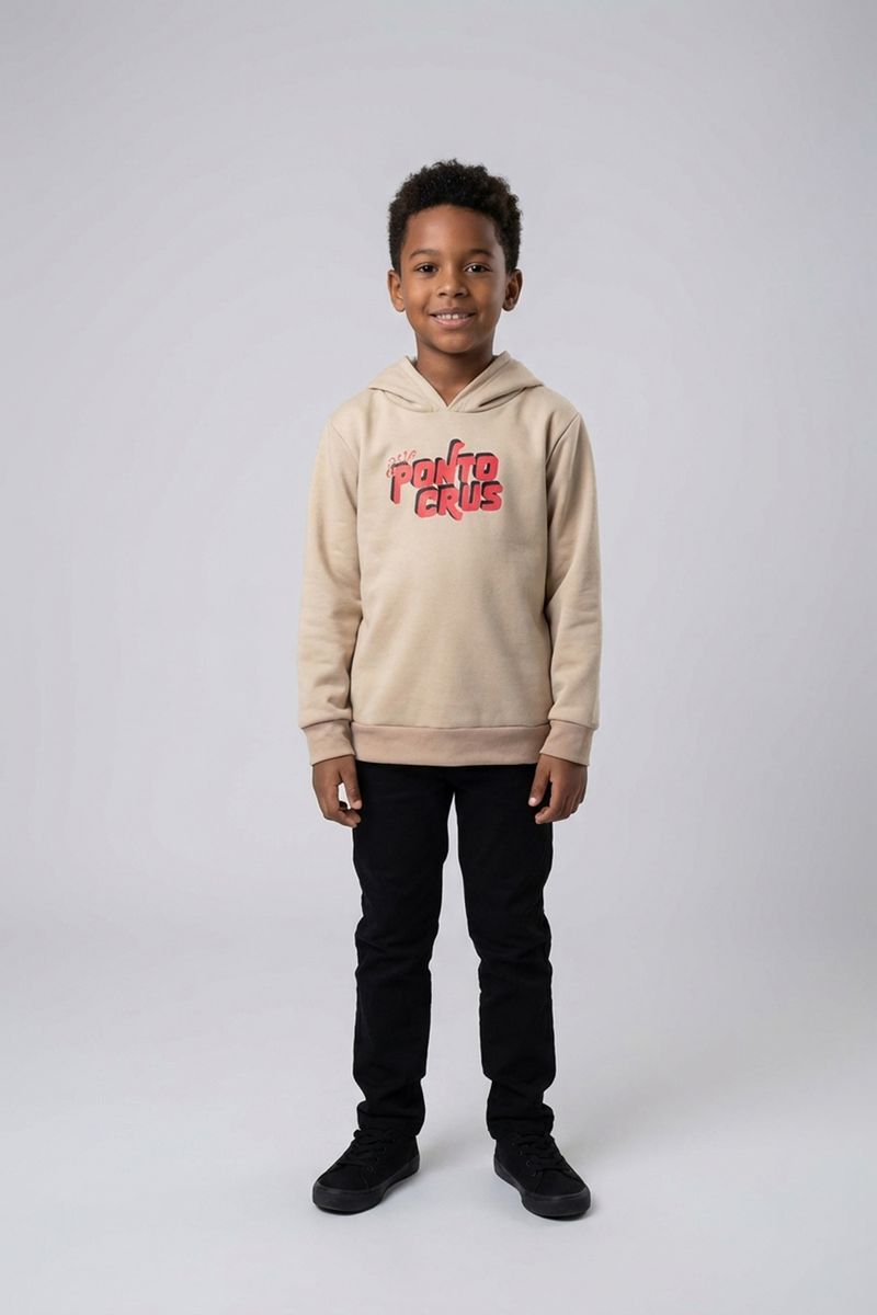 O Blusão de Moletom Infantil Ponto Crus Bege com Capuz Caedu oferece conforto e estilo. Em moletom sem felpa, é ideal para o dia a dia. Com capuz e estampa 'PONTO CRUS', esta roupa da Caedu é a moda.