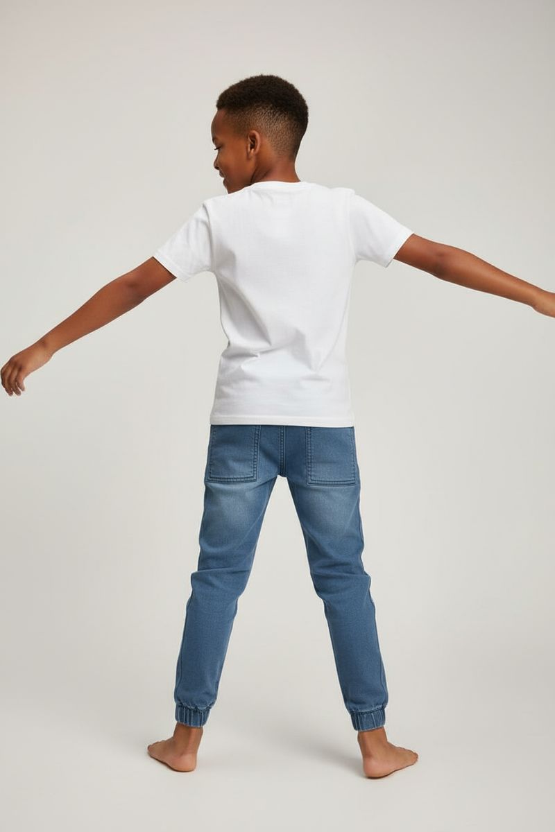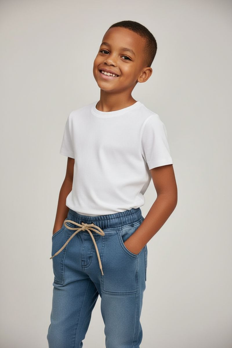 Combine a Calça Jogger Infantil Jeans Azul Claro com uma blusa branca lisa para um visual clássico, ou com uma camiseta estampada para um toque divertido. Complete o look com tênis casuais para conforto ou sapatilhas para um estilo mais arrumado. Uma jaqueta leve pode ser adicionada para um toque extra de estilo.