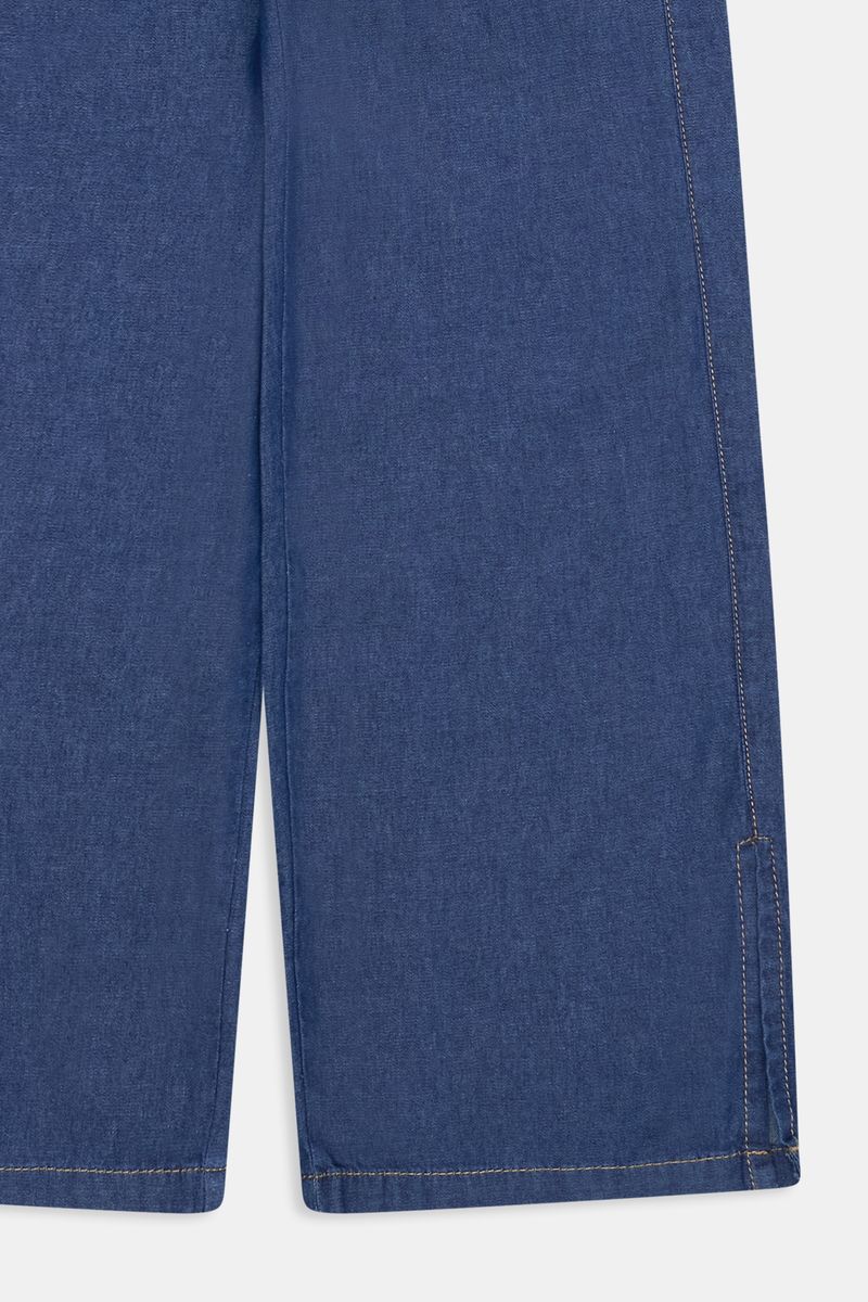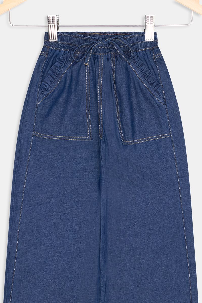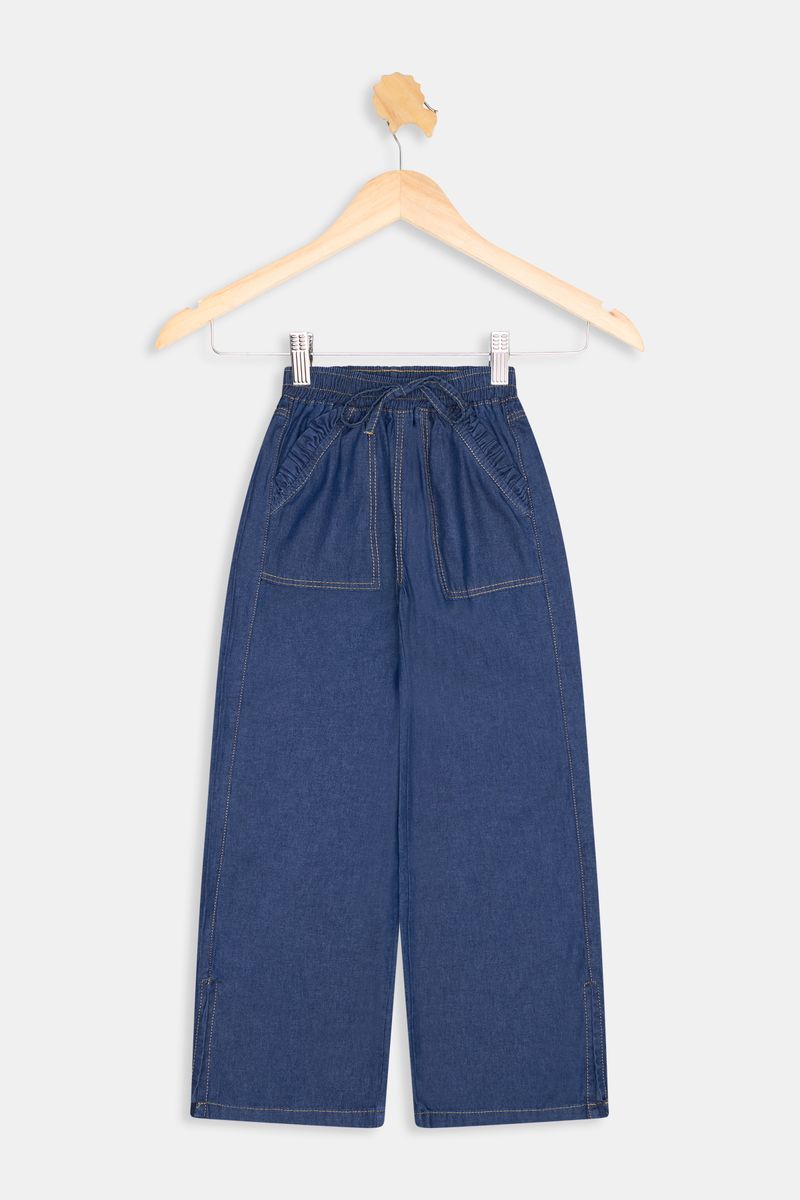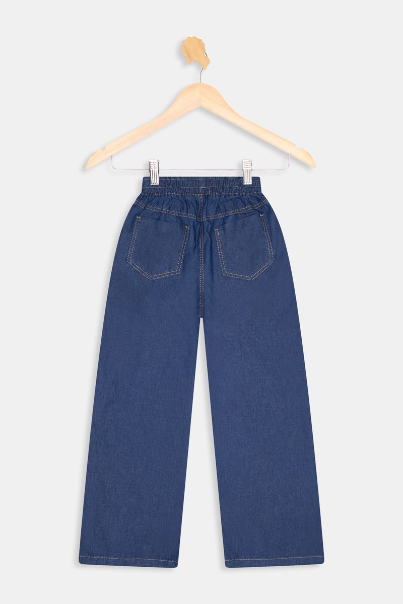A Calça Jeans Wide Leg Infantil Caedu, em denim azul médio, é a roupa ideal para meninas de 10 a 16 anos. Oferece conforto e estilo com cós elástico ajustável e pernas largas. Uma peça Caedu.