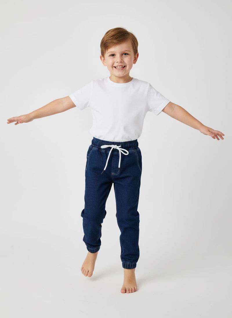 A Calça Jogger Jeans Infantil Azul Escuro Caedu une conforto e versatilidade para o dia a dia. Feita em 100% algodão, seu denim leve e macio proporciona liberdade. Com cintura e punhos elásticos, garante um ajuste perfeito e estilo moderno para as crianças.
