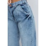 Calça feminina com modelagem baggy, confeccionada em tecido jeans. Possui bolsos, cós com passantes e fechamento em zíper e botão.