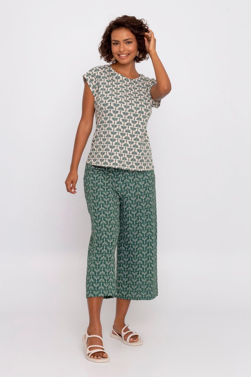 Calça feminina com modelagem pantacourt. A peça possui estampa e caimento reto e solto.