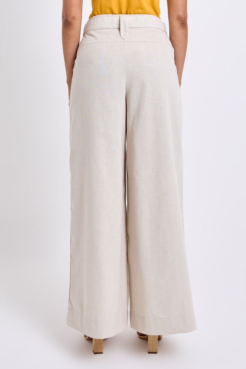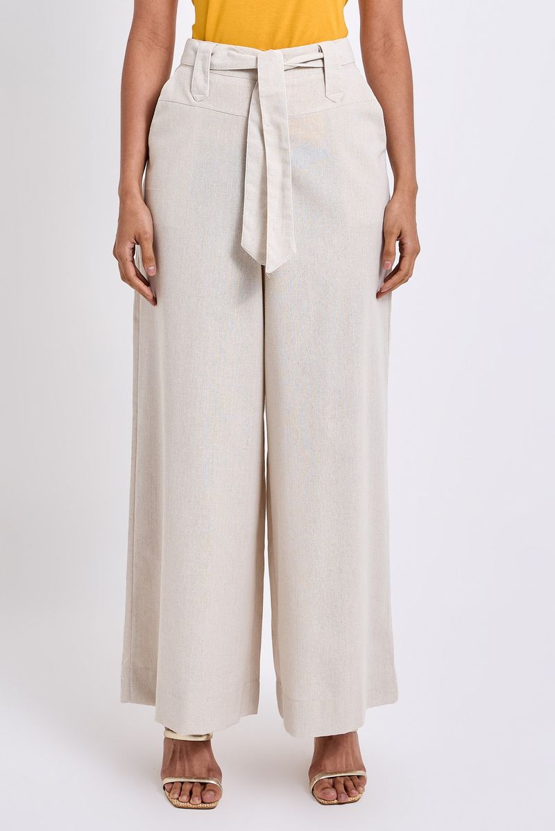 Eleve seu estilo com a Calça Pantalona Feminina Caedu de Linho Bege Claro. Perfeita para um visual elegante e confortável, esta peça de cintura alta com cinto faixa e corte wide leg oferece um caimento impecável e sofisticado para a moda feminina.
