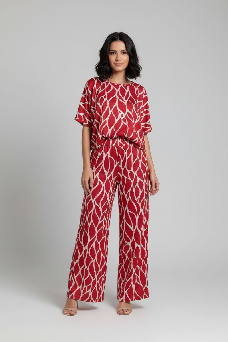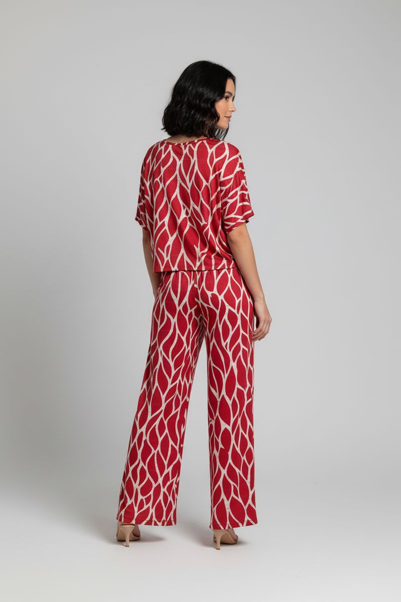 A Calça Pantalona Estampada Folhas Geométricas Vermelhas Caedu redefine a moda feminina com seu design estampado vibrante e material LUREX. Desfrute do conforto da cintura alta e do corte wide leg, ideal para looks que esbanjam personalidade e elegância. Uma peça chave para seu guarda-roupa Caedu.