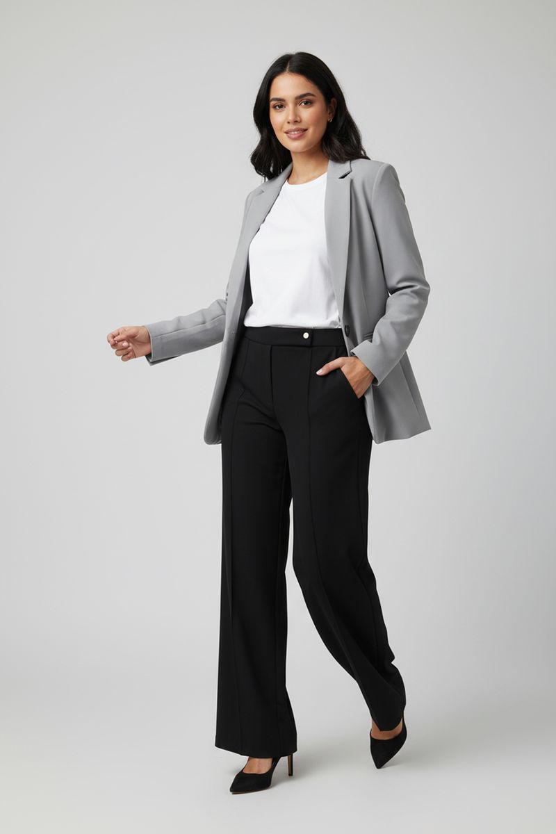 Crie looks versáteis combinando com um blazer cinza claro e uma camiseta básica branca para um visual elegante. Para um toque sofisticado, use com sapatos scarpin pretos de salto alto. Experimente também com blusas estampadas para um estilo mais descontraído.