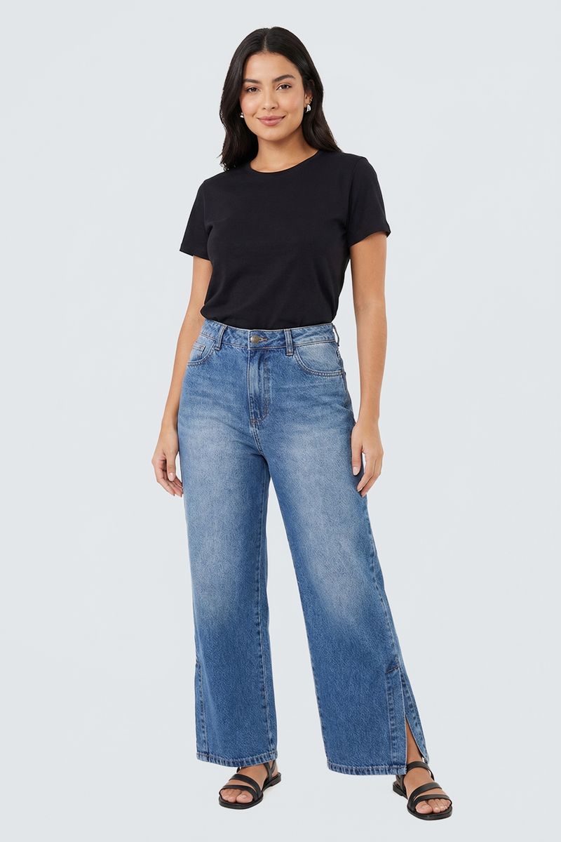 Eleve seu estilo com a Calça Jeans Feminina Wide Leg Caedu. Confortável e moderna, esta peça em jeans azul médio de cintura alta e pernas largas com fenda lateral na barra é perfeita para a mulher que busca moda e versatilidade em suas roupas.