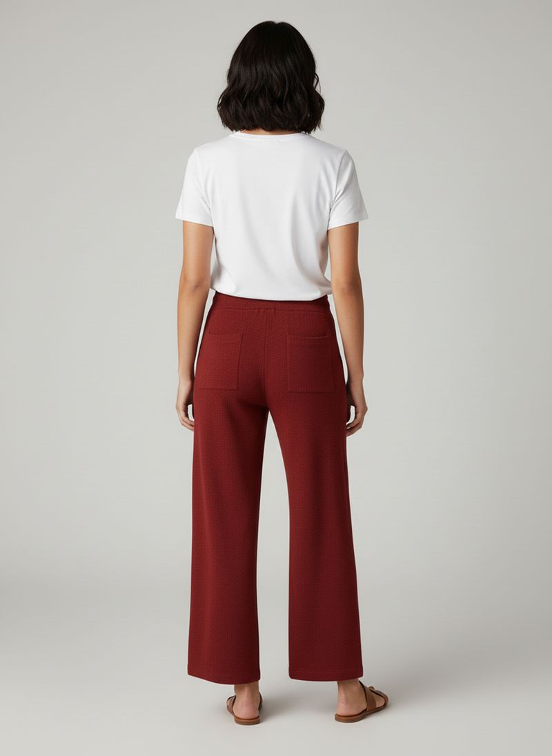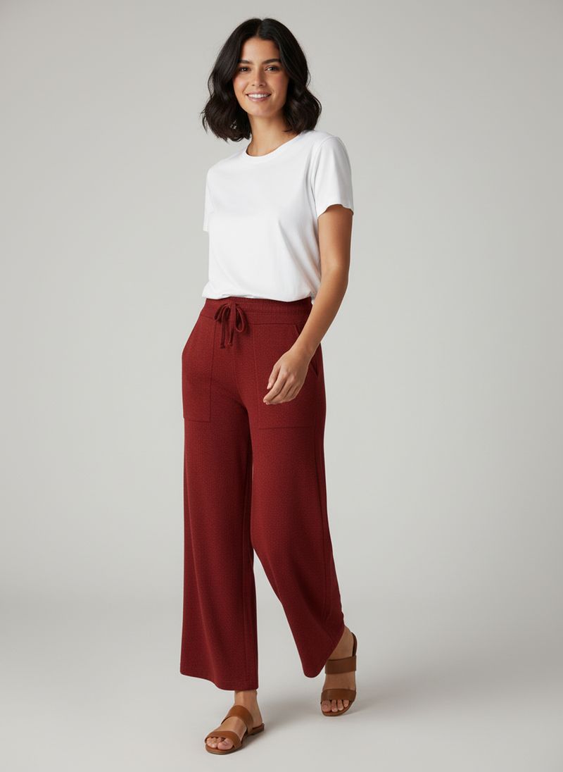 Sinta o auge do estilo e conforto com a Calça Feminina Pantalona Tricô Terracota Caedu. Confeccionada em tricô macio, possui modelagem pantalona de pernas largas, cintura alta e cós de amarração, além de bolsos frontais. Uma peça essencial para a moda feminina que une elegância e praticidade.