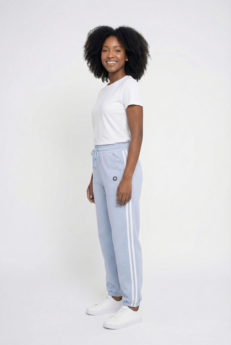 A Calça Jogger Feminina Azul Claro com Listras Laterais Caedu oferece conforto e estilo. Confeccionada em moletom com felpa, possui cordão ajustável e punhos elásticos. Ideal para looks modernos e descontraídos, esta roupa eleva sua moda.