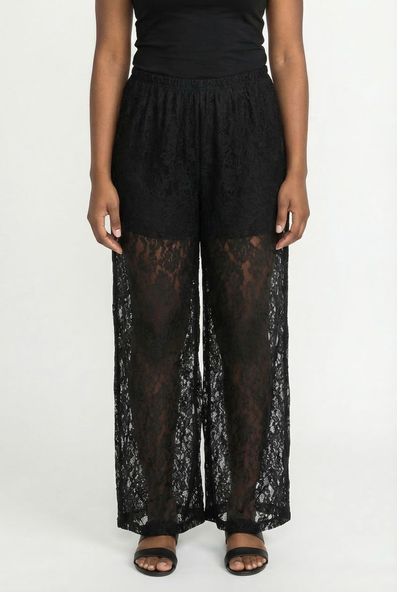 Combine a calça com uma regata preta básica para um look monocromático e elegante, ou com uma blusa de seda para um toque mais sofisticado. Nos pés, sandálias de salto alto ou scarpins complementam o visual. Para um estilo mais despojado, adicione uma jaqueta jeans. Acessórios discretos realçam a beleza da renda.