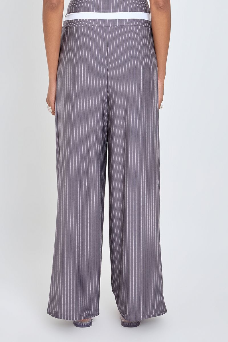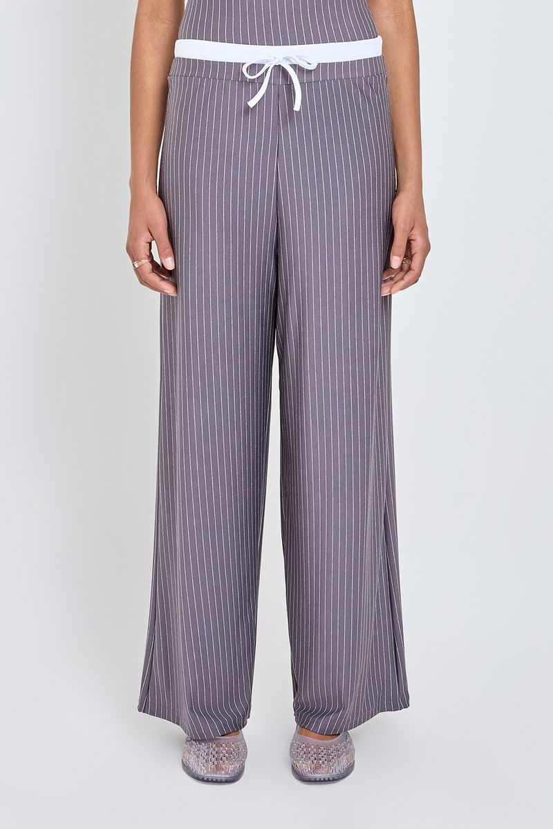 Eleve seu estilo com a Calça Feminina Wide Leg Caedu. Com design risca de giz cinza/branco e cós cueca, oferece conforto e um caimento impecável. Feita em poliéster e elastano, é a roupa perfeita para um look moderno e elegante, ideal para a moda atual.