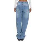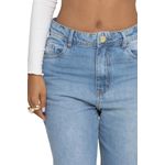Calça feminina modelo wide leg, confeccionada em jeans claro com efeito destroyed e rasgos nos joelhos. Possui fechamento por botão e zíper, bolsos frontais e traseiros funcionais.