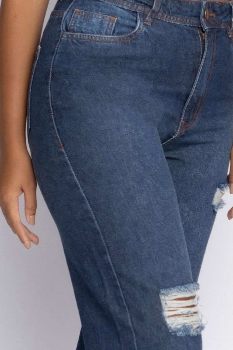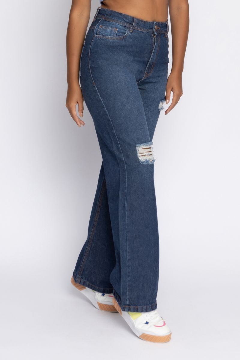 Calça feminina modelo wide leg, confeccionada em tecido jeans com efeito destroyed. Possui bolsos, cós com passantes e fechamento em zíper e botão.