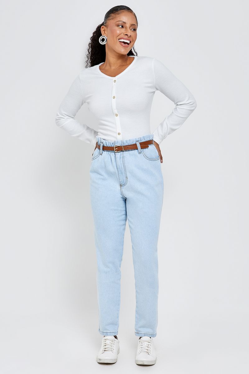 Combine sua Calça Clochard Jeans Claro com uma camisa branca para um look clássico ou uma blusa estampada para um toque de cor. Nos pés, tênis brancos garantem conforto, enquanto sandálias de salto criam um visual mais elegante. Para um toque final, adicione uma jaqueta jeans ou um blazer leve.
