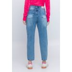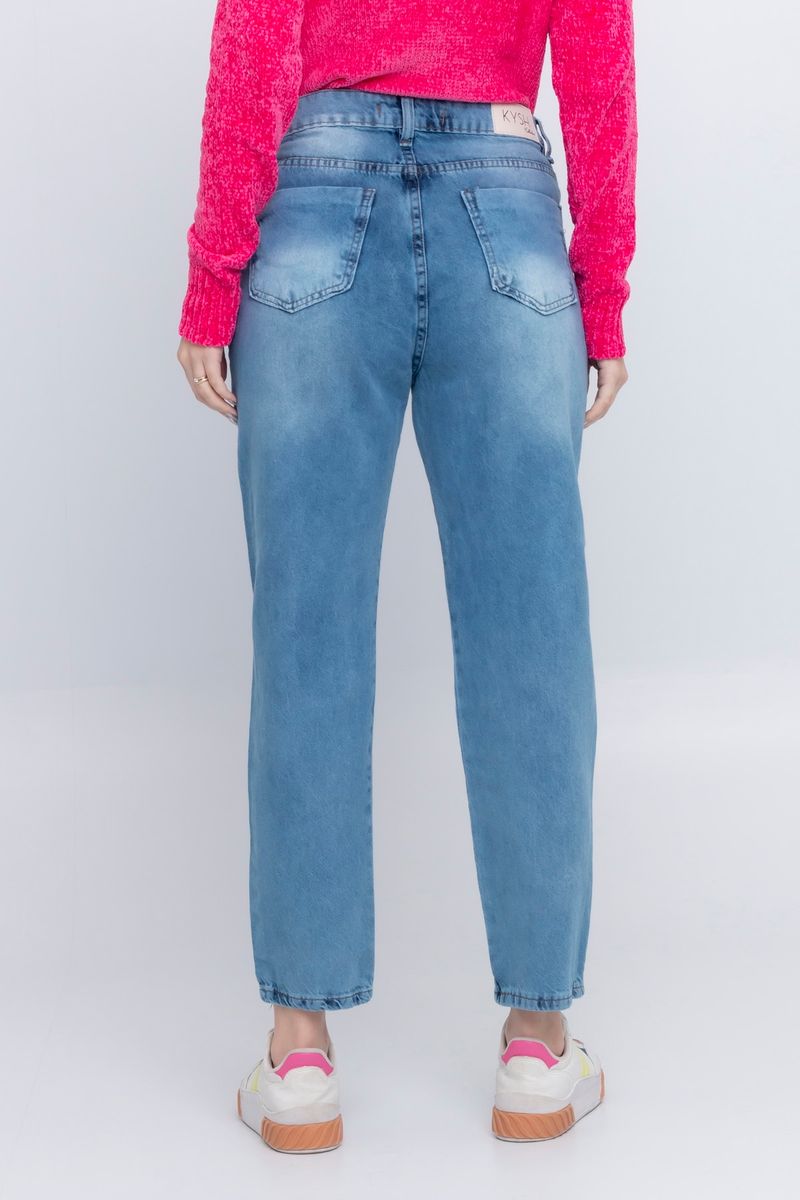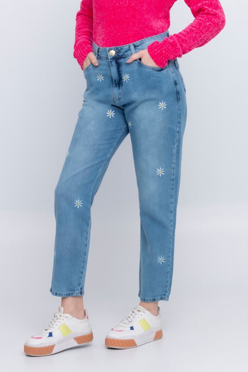 Calça Mom Jeans Feminina com Bordado Azul Médio