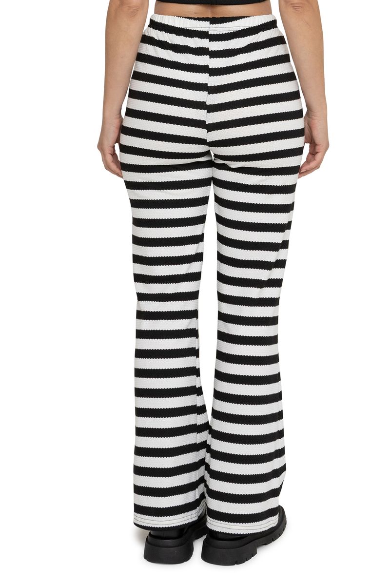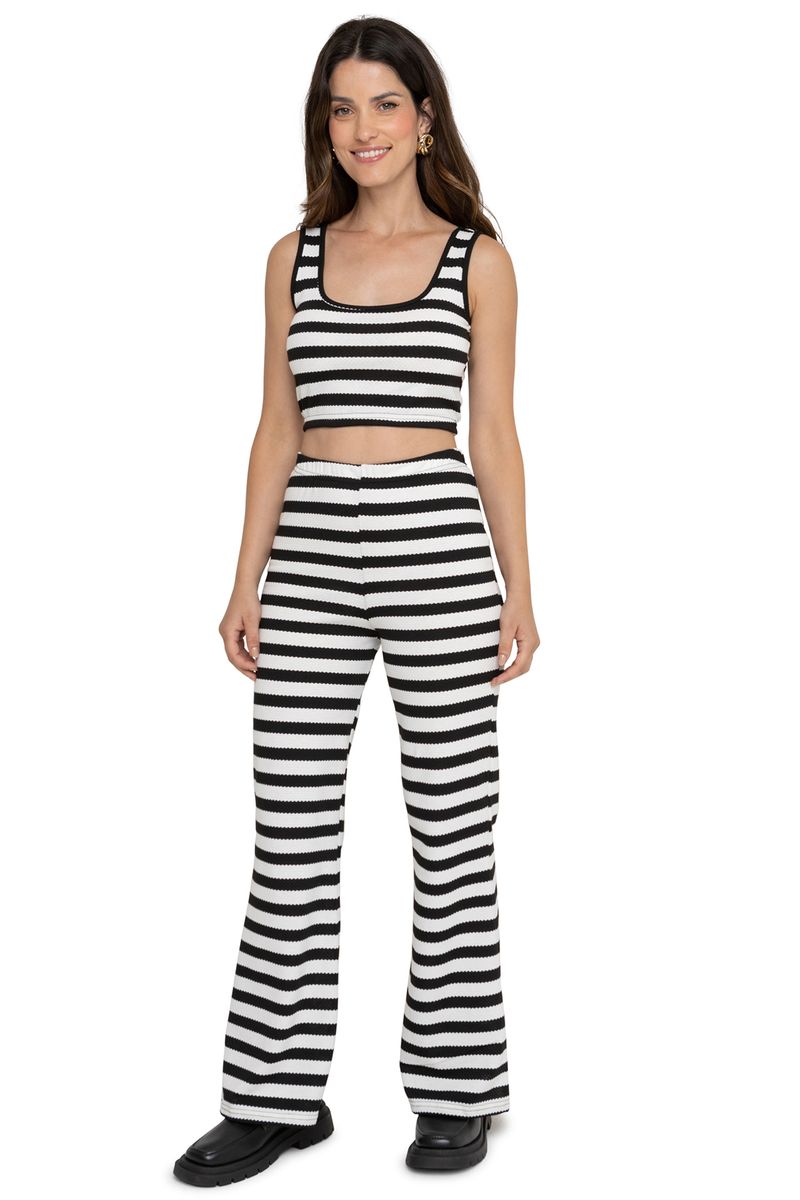 Calça feminina com modelagem reta, com estampa listras texturizada nas cores preto e branco.