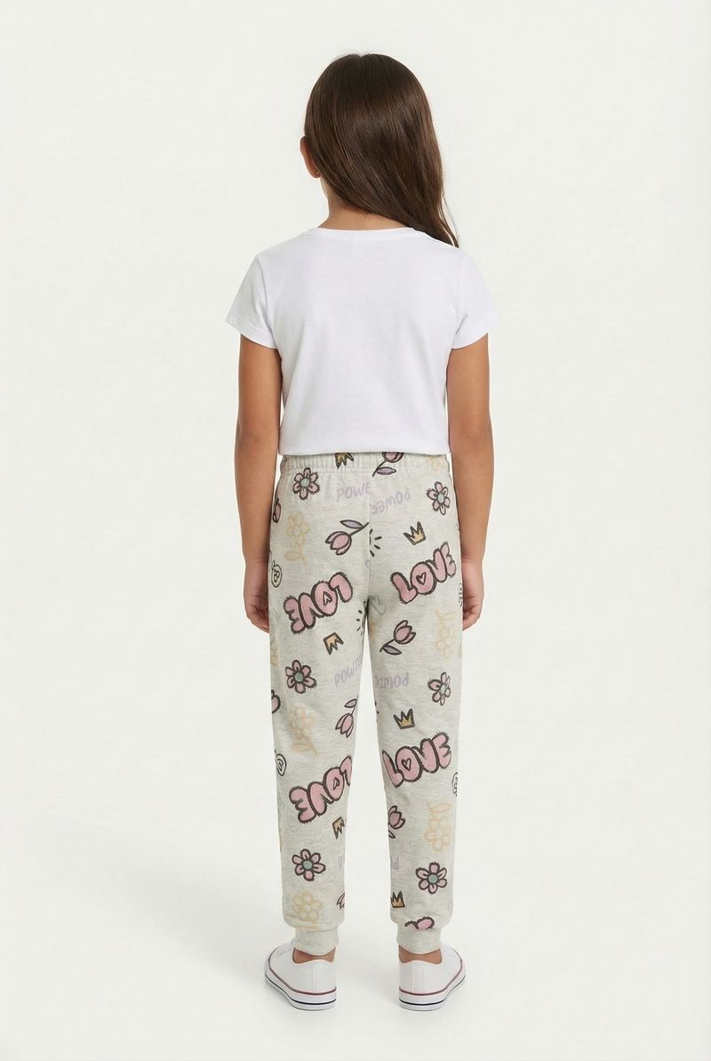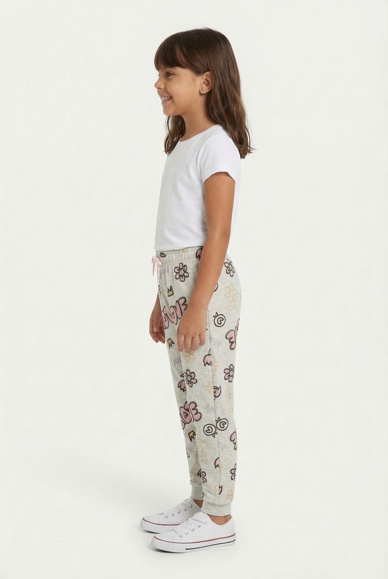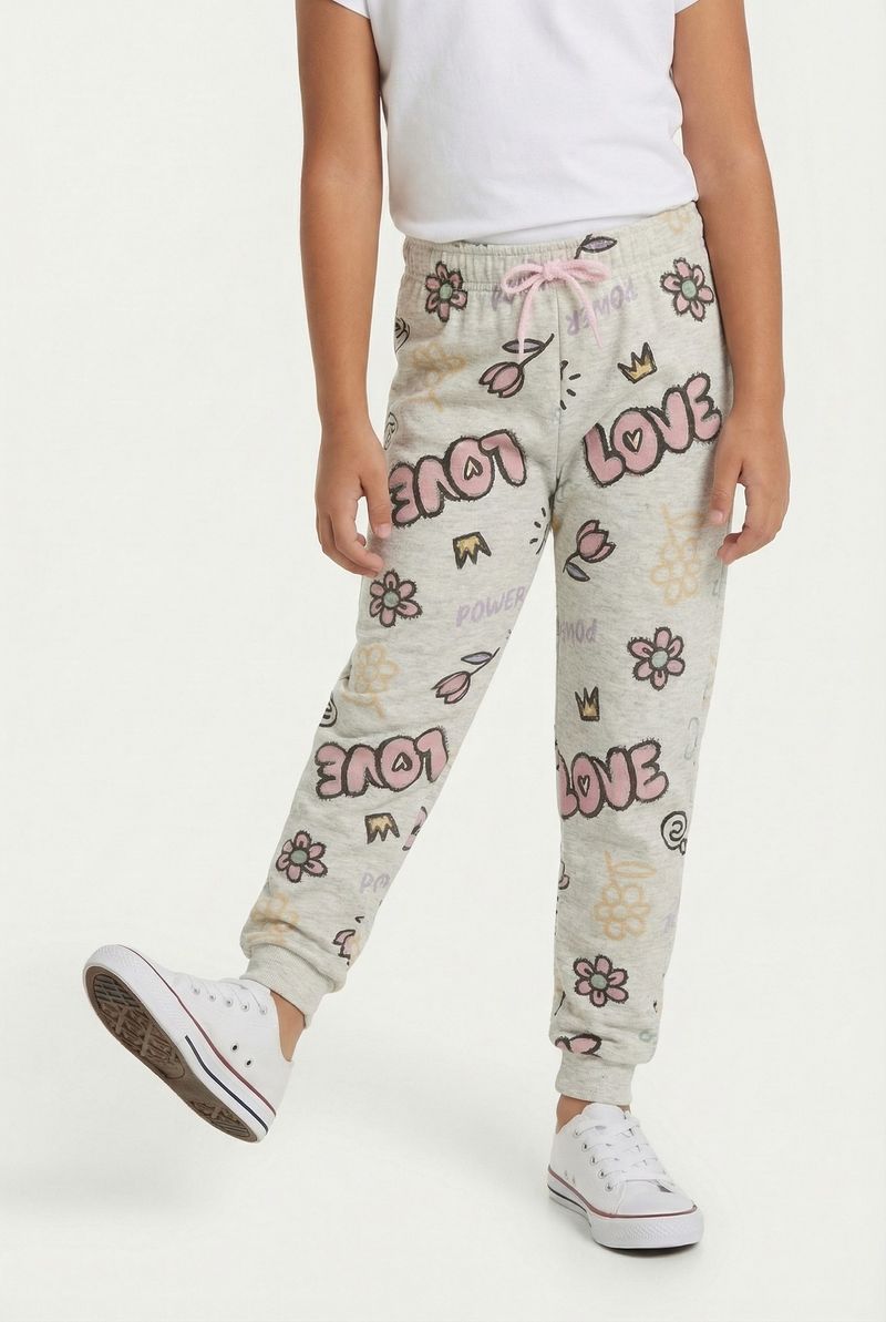 A Calça Jogger Infantil Estampada 'Love & Flores' Caedu oferece conforto e estilo. Em moletom com felpa 100% poliéster, garante maciez e liberdade. Sua estampa vibrante e cintura elástica ajustável é ideal para o dia a dia, um toque de alegria.