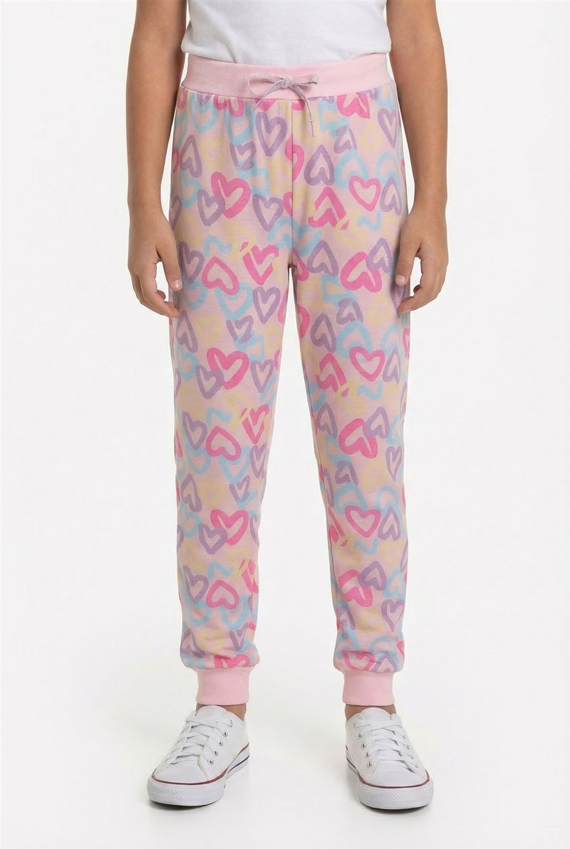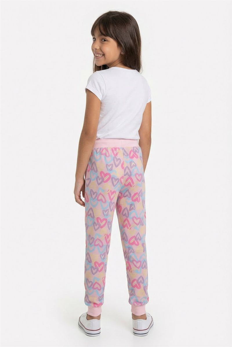 A Calça Infantil Jogger Corações Mágicos Caedu oferece conforto e estilo para as pequenas. Com estampa encantadora em tons pastéis e cós elástico rosa, é perfeita para brincar com liberdade. Feita em moletom com felpa, garante maciez e aconchego.