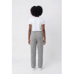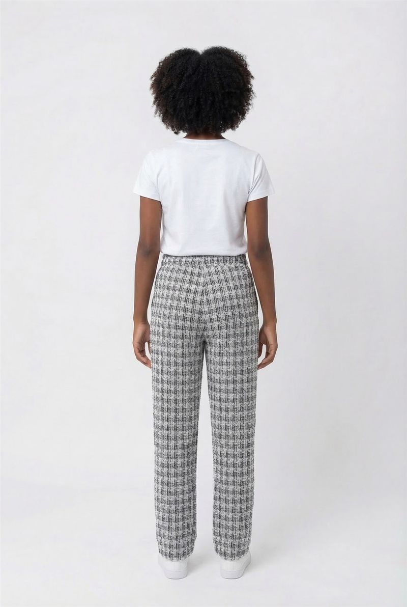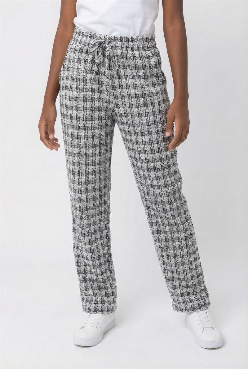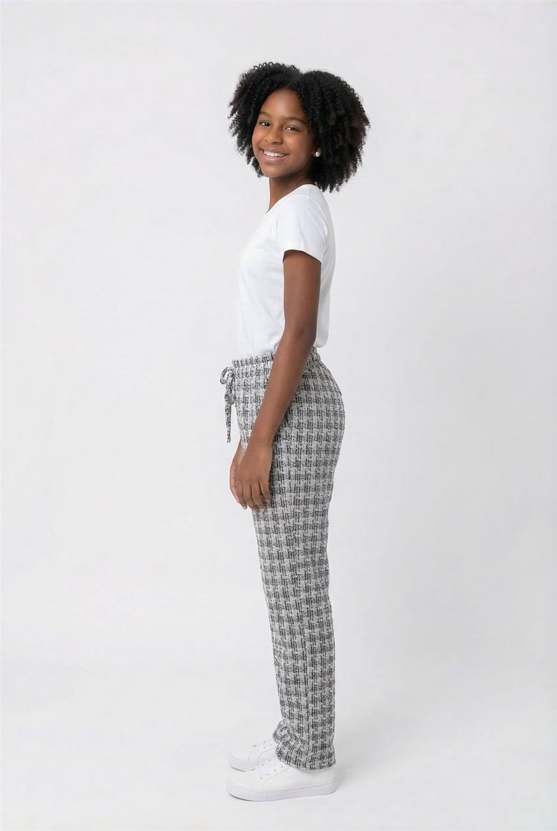 A Calça Juvenil Moderna Tweed Xadrez Caedu oferece um visual moderno e confortável para o dia a dia. Com estampa xadrez em preto e branco, cós elástico e amarração, esta roupa é perfeita para quem busca estilo e praticidade na moda infantil.