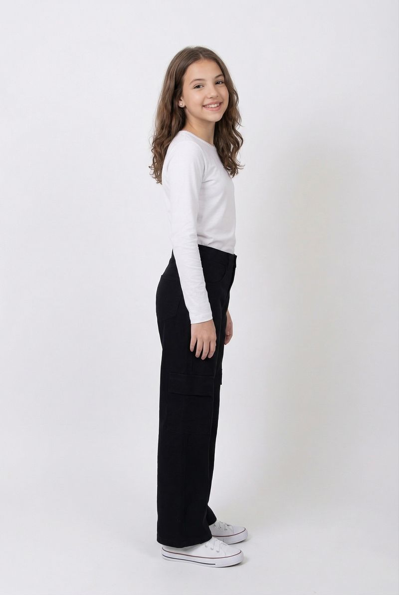 A Calça Juvenil Wide Leg Cargo de Sarja Preta Caedu é a peça ideal para um visual moderno e despojado. Confeccionada em sarja resistente, oferece conforto e durabilidade. Com modelagem wide leg e práticos bolsos cargo, é perfeita para acompanhar as tendências da nova coleção Outono Inverno.