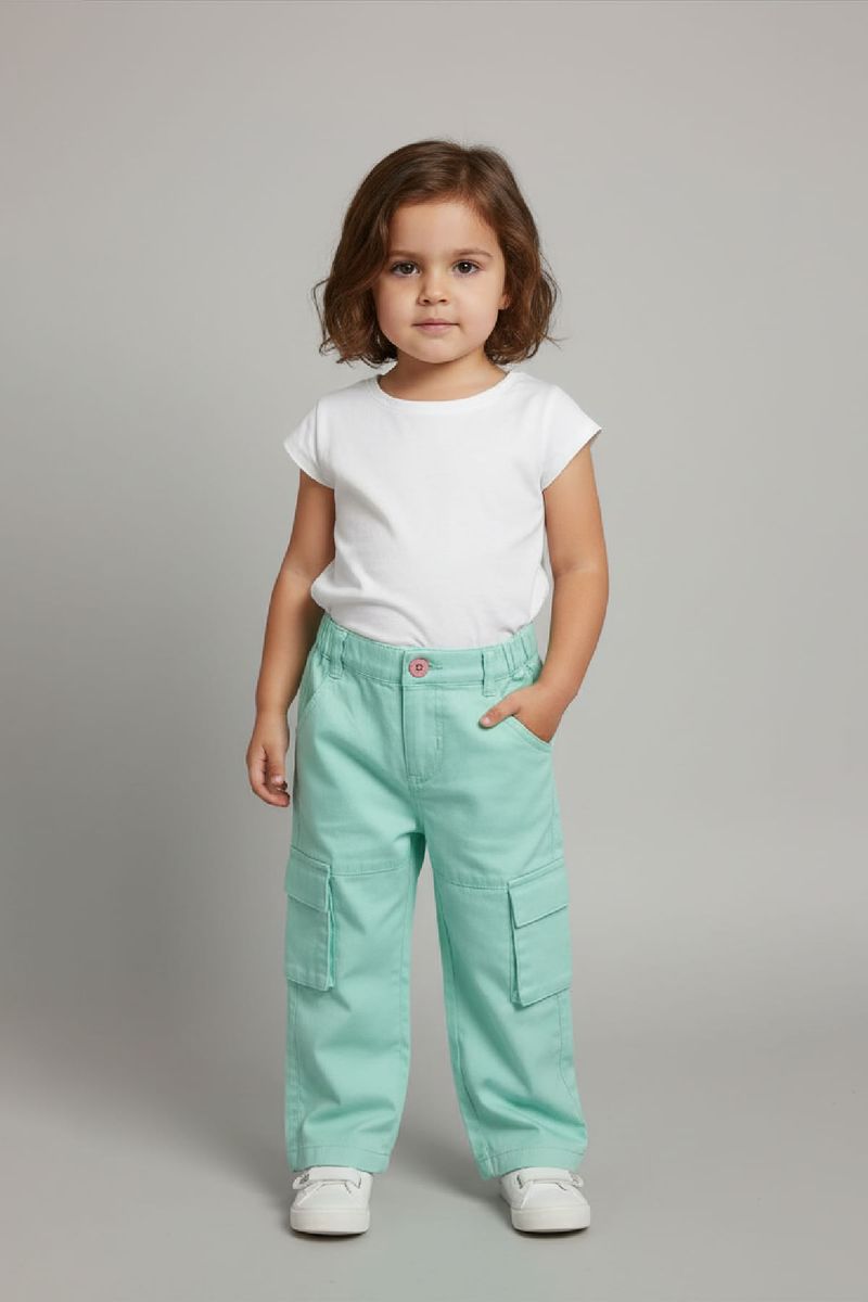 A Calça Cargo Infantil Caedu em sarja aqua é a escolha perfeita para o dia a dia das pequenas. Com design moderno e cor verde claro, oferece conforto e liberdade para brincar. Seus bolsos cargo adicionam um toque de estilo e praticidade, ideal para a moda infantil Caedu.