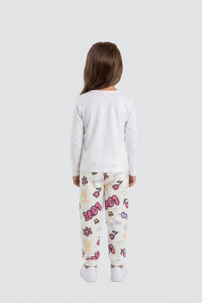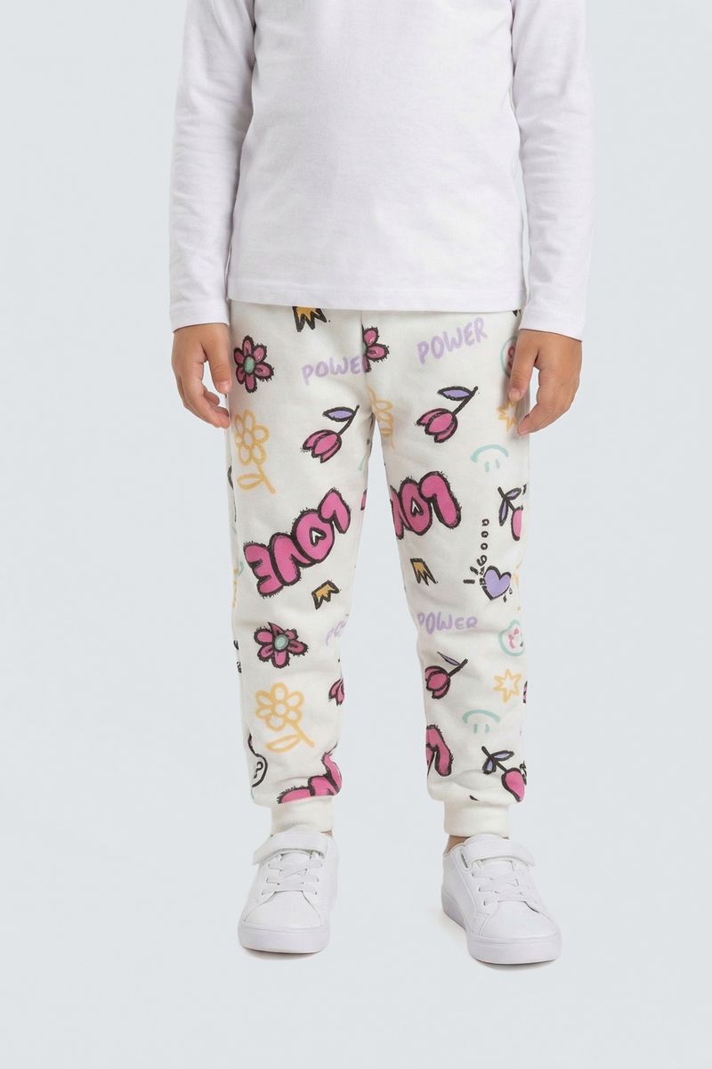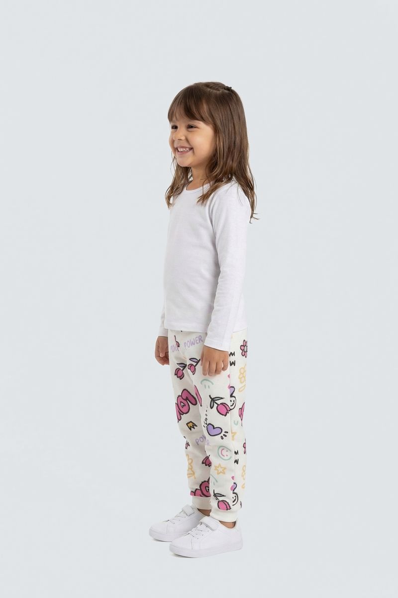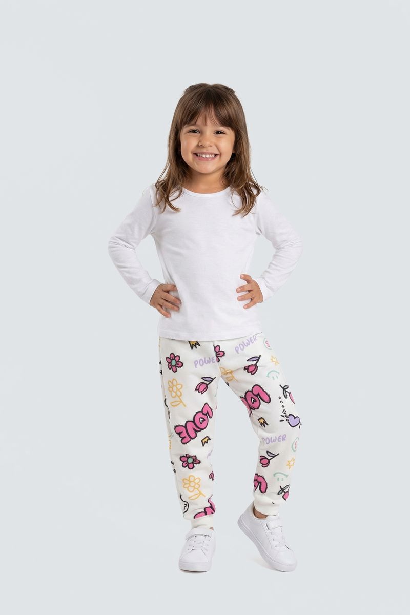 A calça infantil Caedu de moletom com felpa oferece conforto e estilo para as pequenas. Com sua cor off-white e estampa vibrante 'Love & Power', esta roupa infantil é perfeita para brincar com liberdade e expressar personalidade.