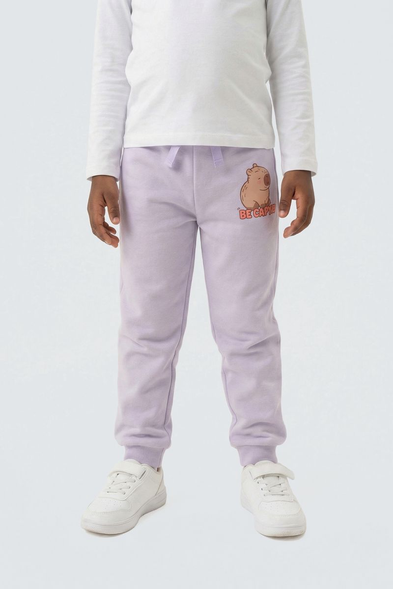Descubra a Calça Jogger Infantil Caedu, perfeita para os pequenos aventureiros! Com seu tecido em moletom com felpa e cor lilás vibrante, esta roupa infantil oferece conforto e estilo. A estampa exclusiva de capivara 'Be Capy' adiciona um toque divertido e original ao guarda-roupa, ideal para o dia a dia.