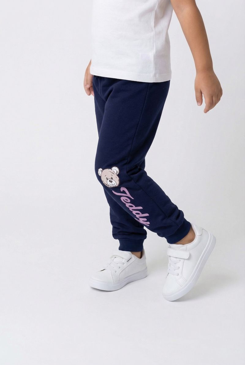 A Calça Jogger Infantil Caedu Azul Marinho com Ursinho Teddy oferece conforto e estilo para os pequenos. Feita em moletom com felpa 100% poliéster, possui cós e punhos elásticos para liberdade de movimento. O charmoso ursinho Teddy adiciona um toque divertido à roupa infantil, ideal para o dia a dia.