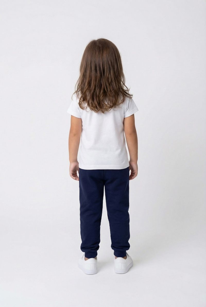 Combine a calça jogger azul marinho com blusas de cores claras ou estampadas para um visual descontraído. Para um look completo, adicione um tênis branco casual e uma jaqueta leve em dias mais frescos, criando um conjunto prático e cheio de personalidade para a moda infantil.