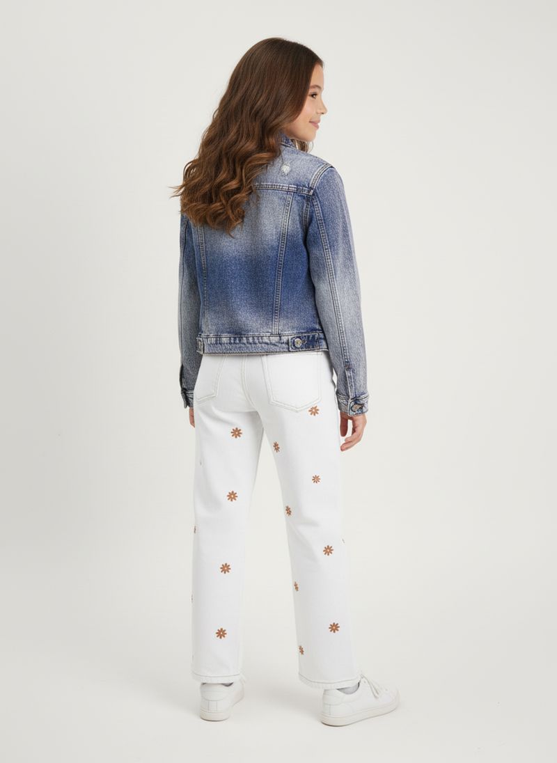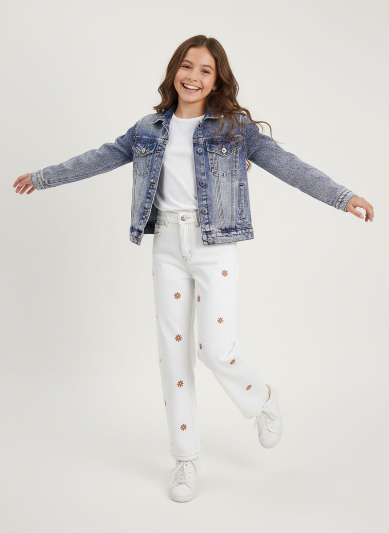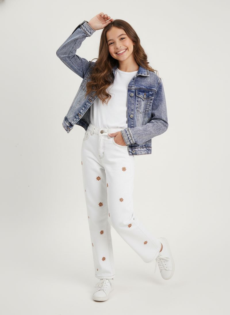 A Calça Jeans Juvenil Caedu oferece conforto e estilo. Feita em 100% algodão denim, esta roupa branca bordada com delicadas flores é perfeita para um visual charmoso e duradouro. Descubra a moda Caedu!