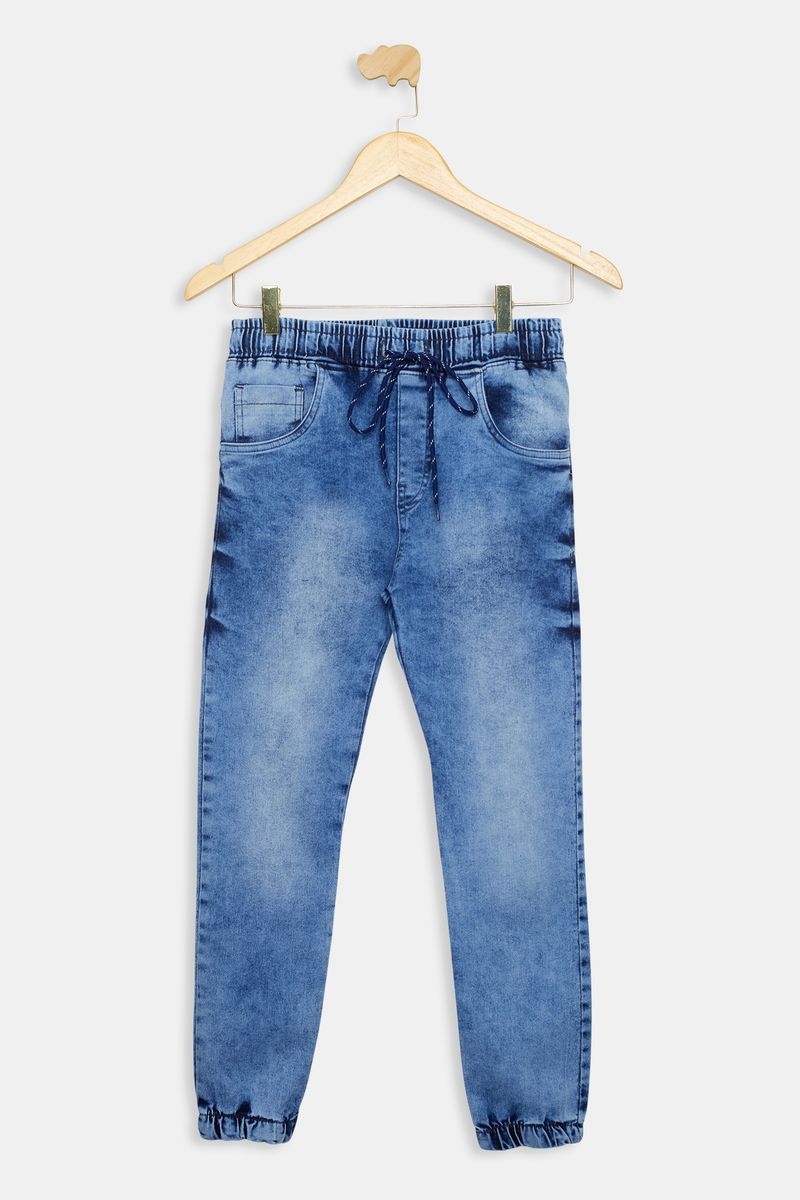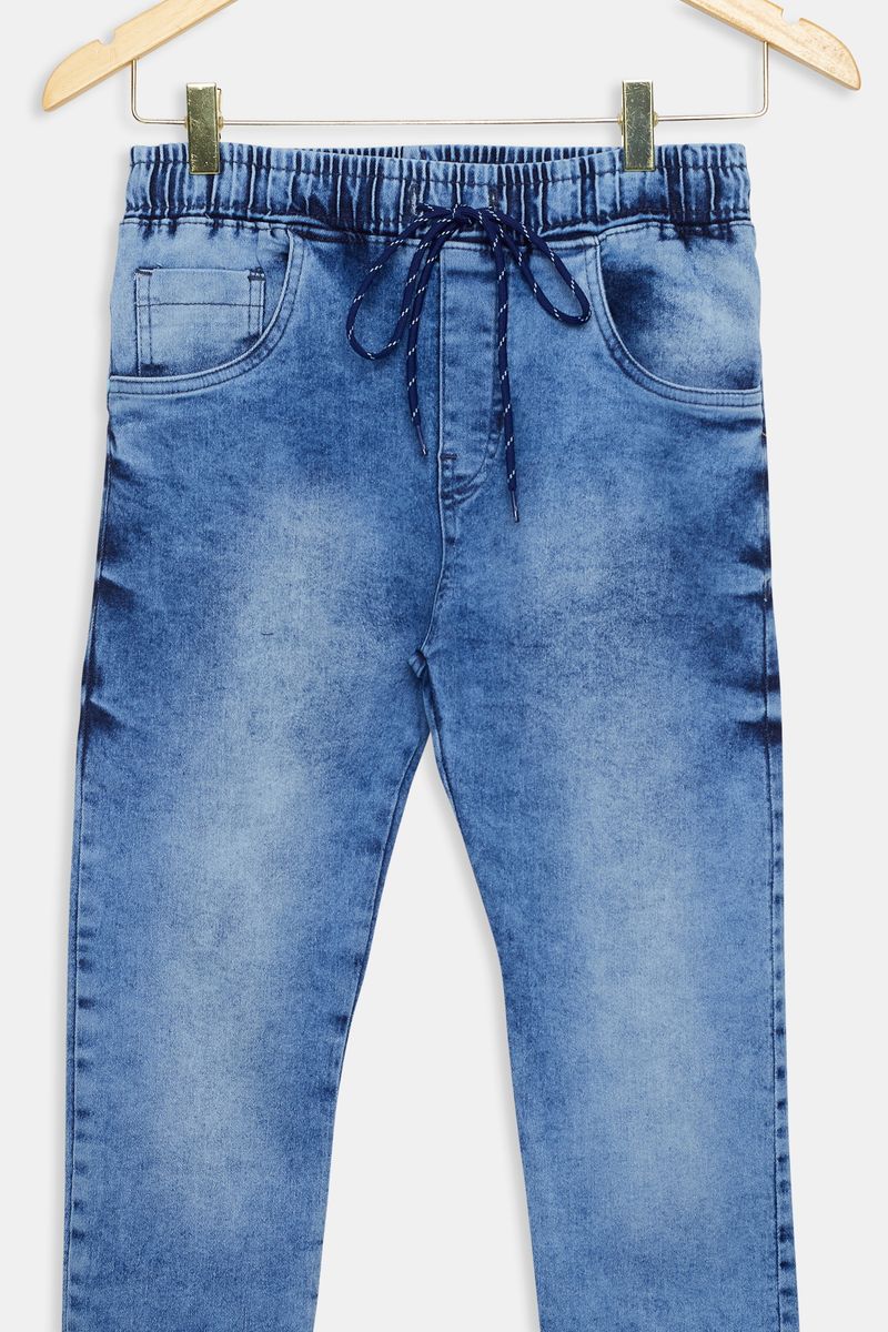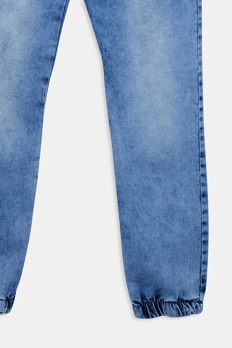 Calça jeans juvenil jogger com efeito marmorizado em azul médio. Moderna e cheia de estilo.