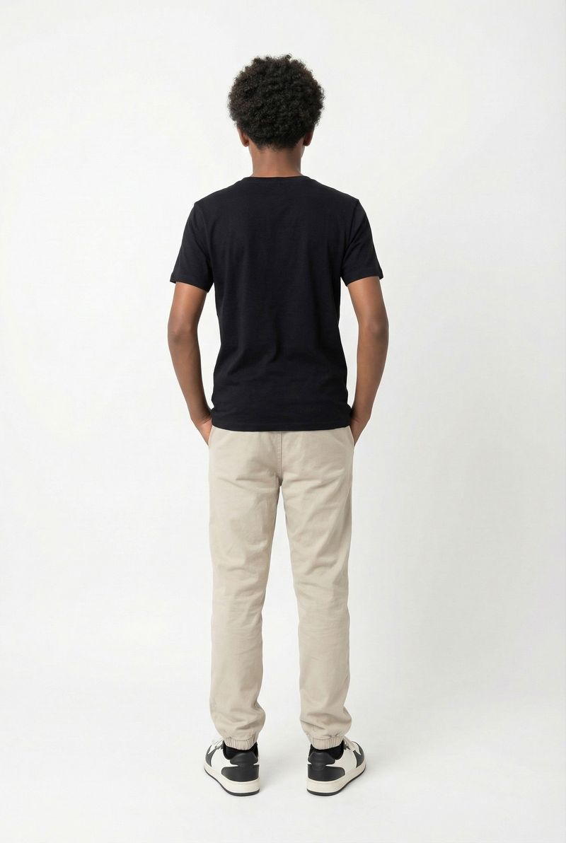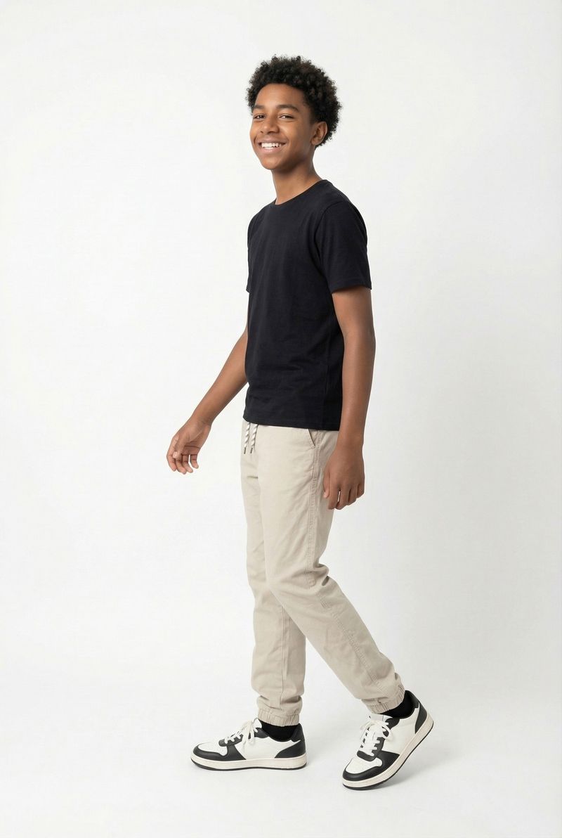 Calça Jogger Juvenil Bege Claro com camisetas básicas para um visual casual, ou blusas mais elaboradas para um toque de estilo. Use tênis de cano baixo para conforto e um boné para um look despojado. Para dias mais frescos, adicione uma jaqueta jeans ou um moletom, criando camadas modernas e cheias de personalidade.
