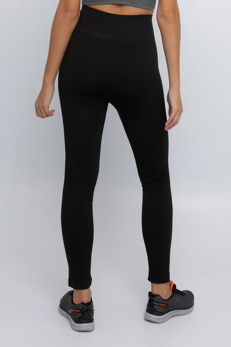 Calça legging feminina esportiva na cor preta. A peça possui elástico no cós e caimento justo.