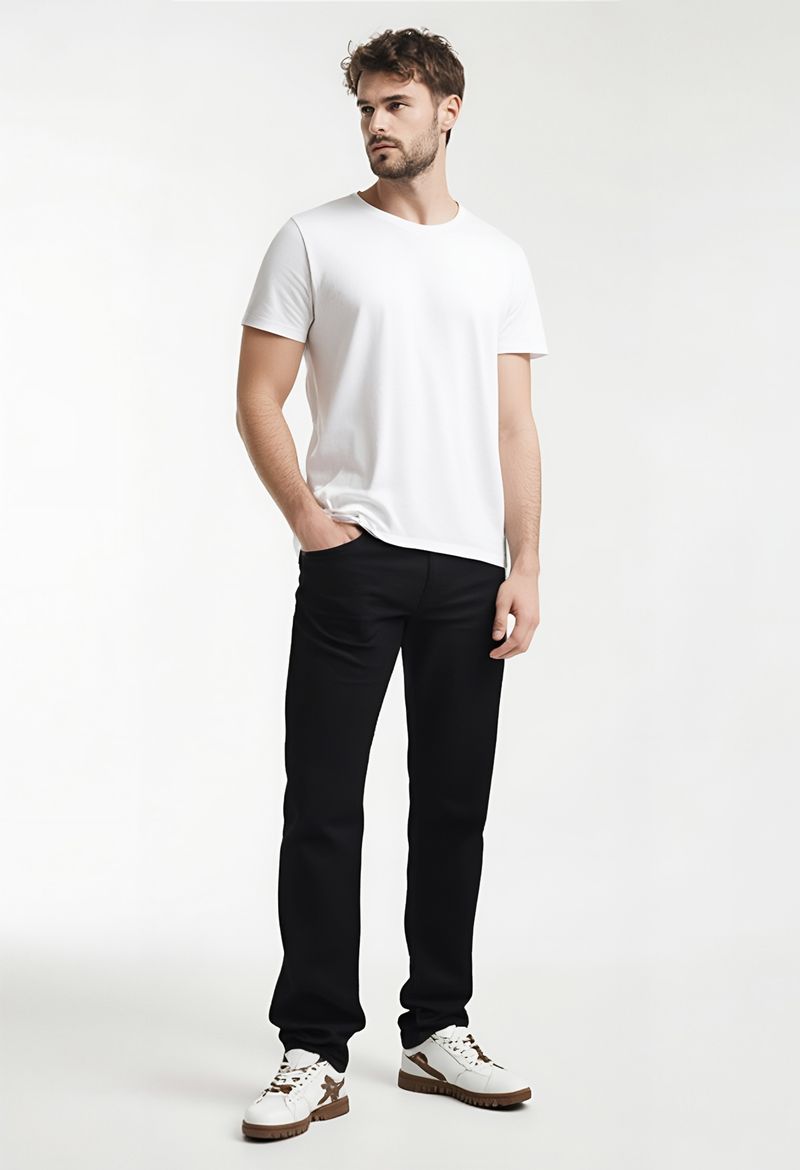 Calça Masculina Slim Jeans Preto Caedu com camisetas básicas para um look casual, ou com camisas sociais para um toque mais sofisticado. Adicione jaquetas de couro ou jeans para sobreposição. Nos pés, tênis brancos ou botas complementam o visual, criando um