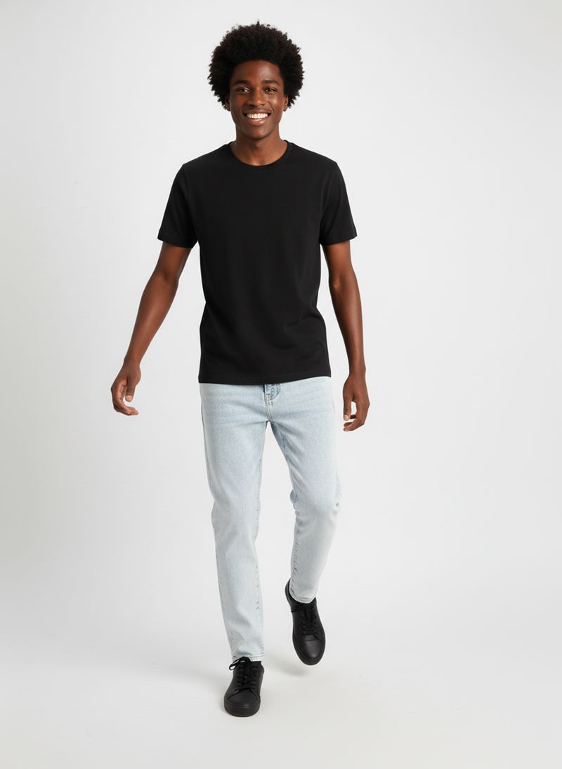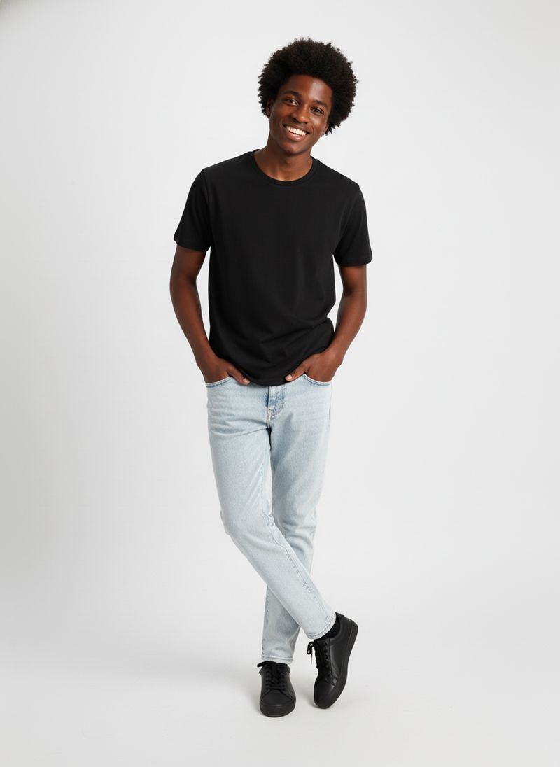 Combine sua Calça Jeans Masculina Azul Claro Essencial com uma camiseta preta básica para um look casual e atemporal. Para um toque mais despojado, adicione tênis pretos de cano baixo. Experimente também com camisas polo ou jaquetas leves para criar diferentes estilos, sempre com muito conforto e moda.