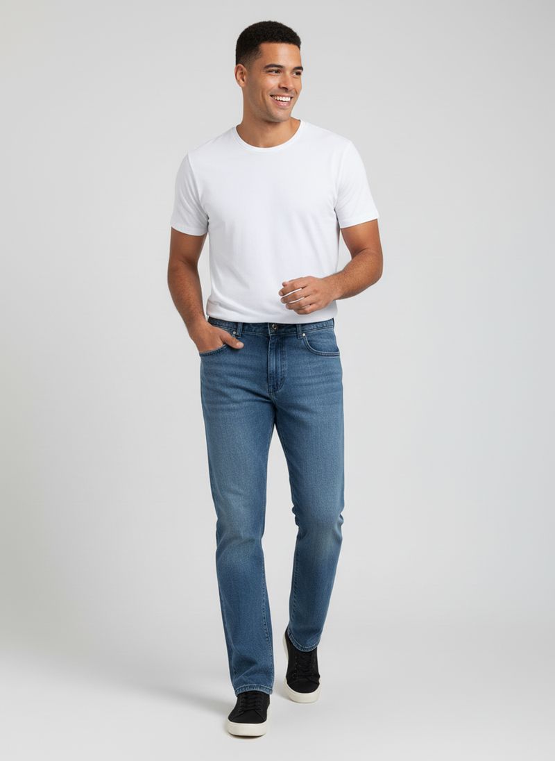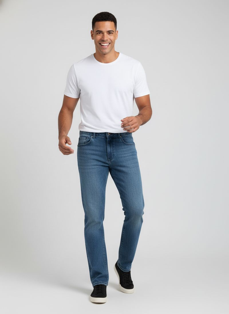 Combine sua Calça Jeans Masculina Reta Azul Médio com uma camiseta básica branca para um visual casual e atemporal, como visto nas roupas Caedu. Para um toque mais despojado, adicione tênis modernos. Em dias mais amenos, uma camisa xadrez ou jaqueta leve complementa o look com elegância, criando um estilo único na moda.