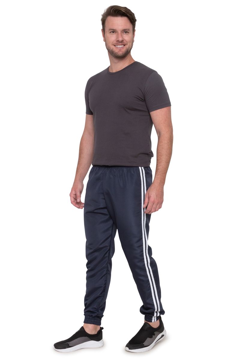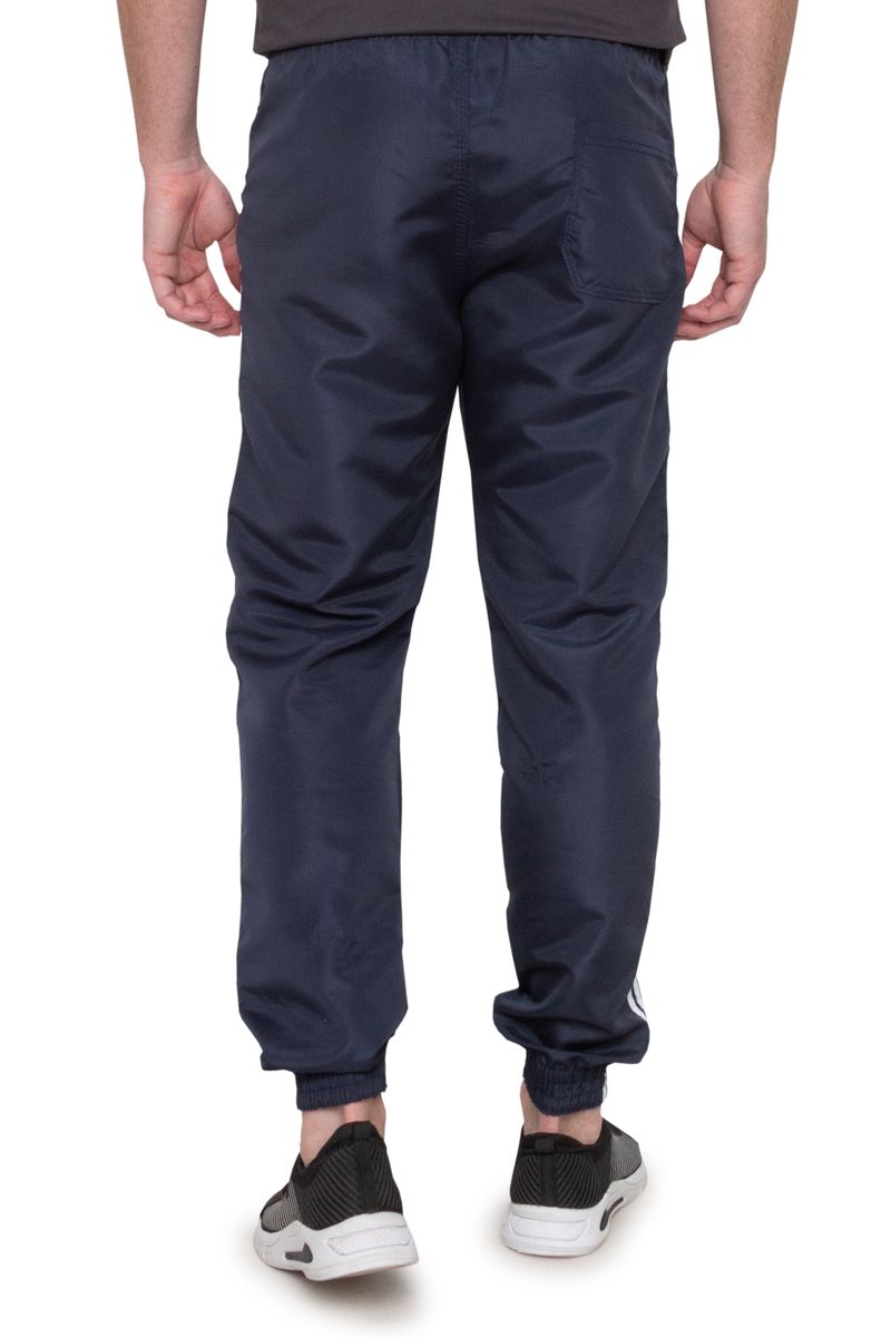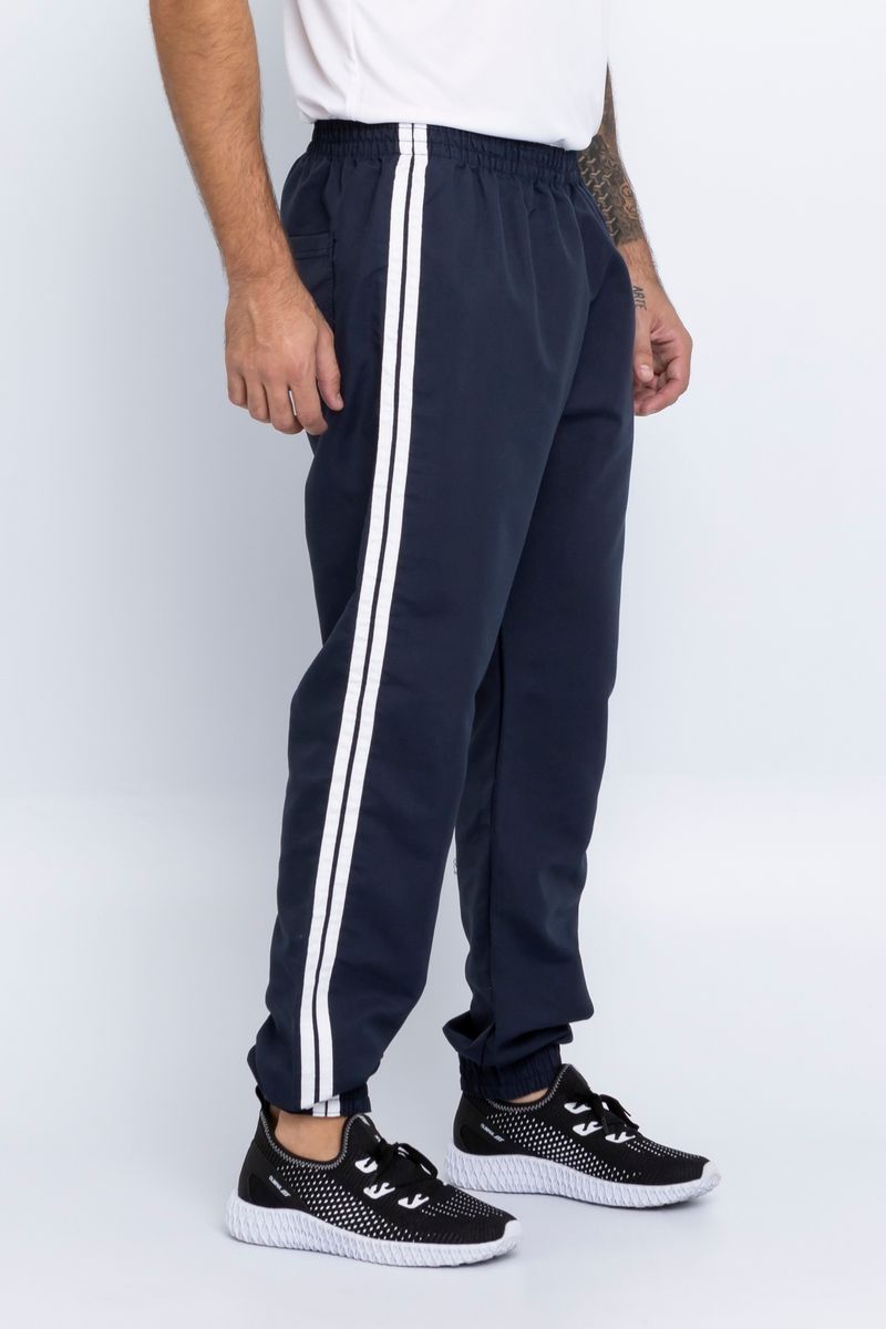 Calça jogger masculina esportiva azul-marinho com faixas brancas laterais.