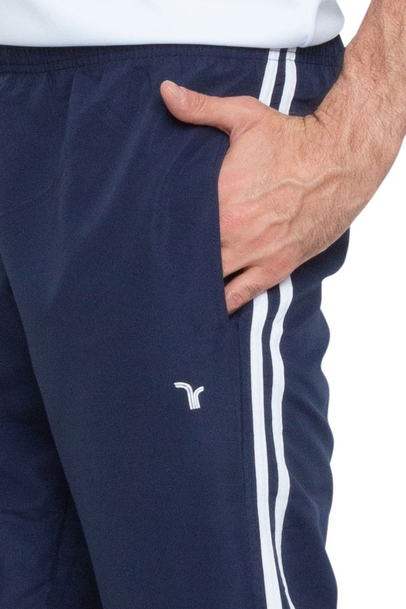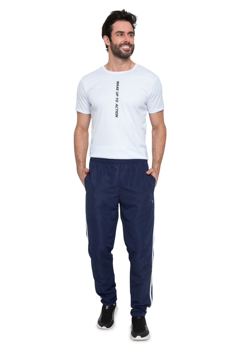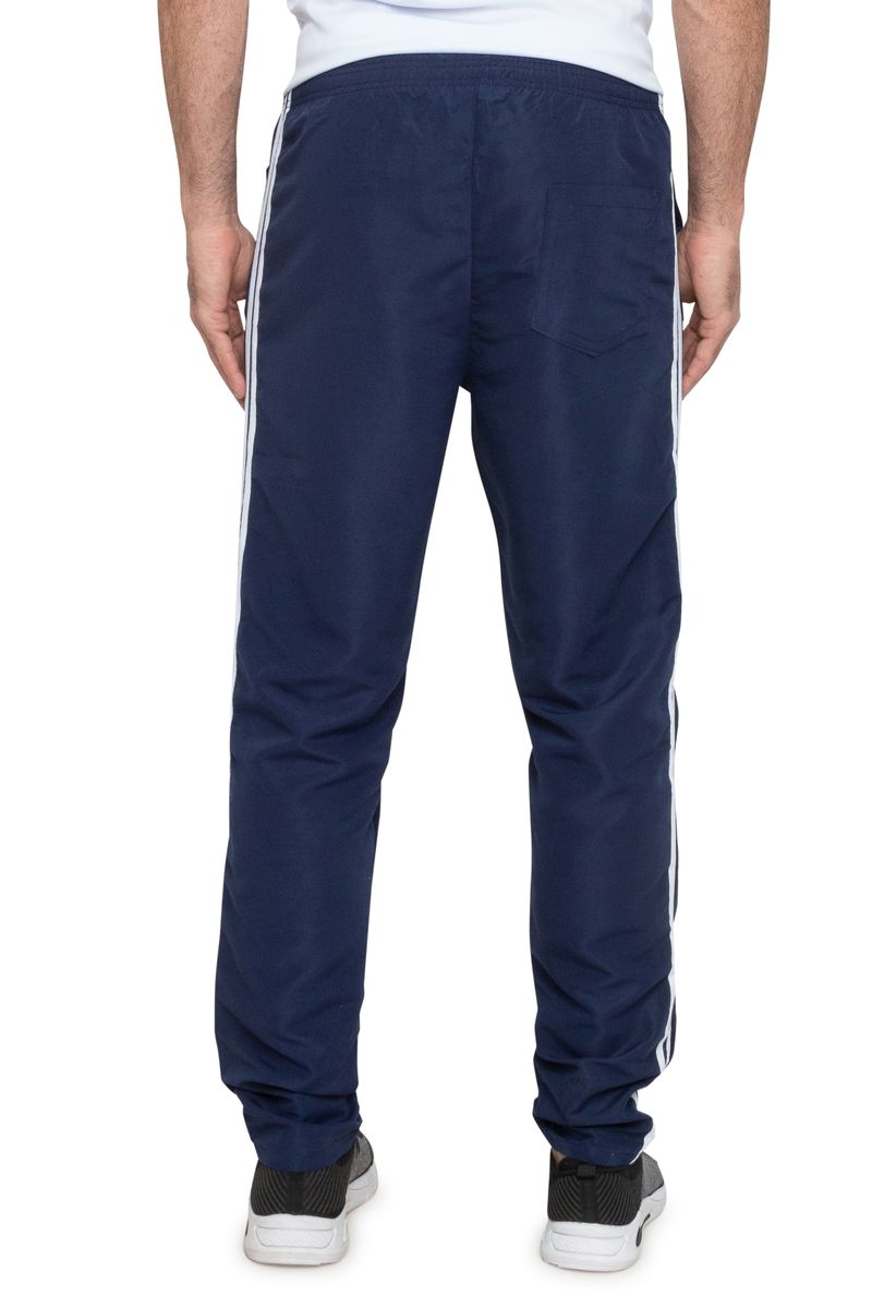 Calça masculina na azul marinho. A peça é básica e conta com caimento reto e solto. Conta com listras brancas nas laterais e bolso único traseiro.