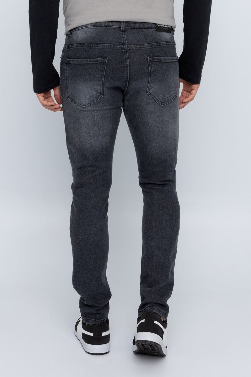 Calça masculina com modelagem skinny, confeccionada em tecido jeans. Possui bolsos frontais e traseiros, cós com passantes e fechamento em zíper e botão.