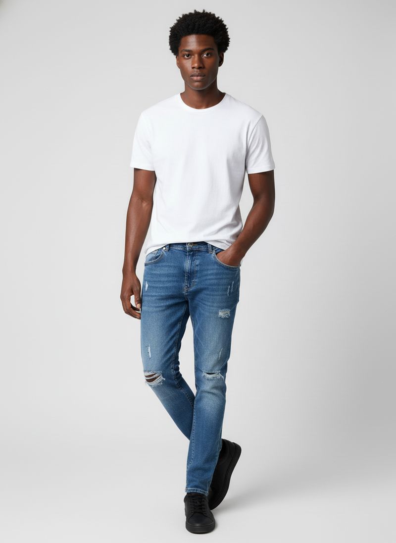 Combine sua Calça Jeans Masculina Skinny Destroyed Azul Médio Caedu com camisetas básicas para um visual despojado, ou com camisas polo para um toque mais arrumado. Para os pés, tênis casuais ou botas adicionam personalidade. Uma jaqueta jeans ou de couro complementa o look com estilo.