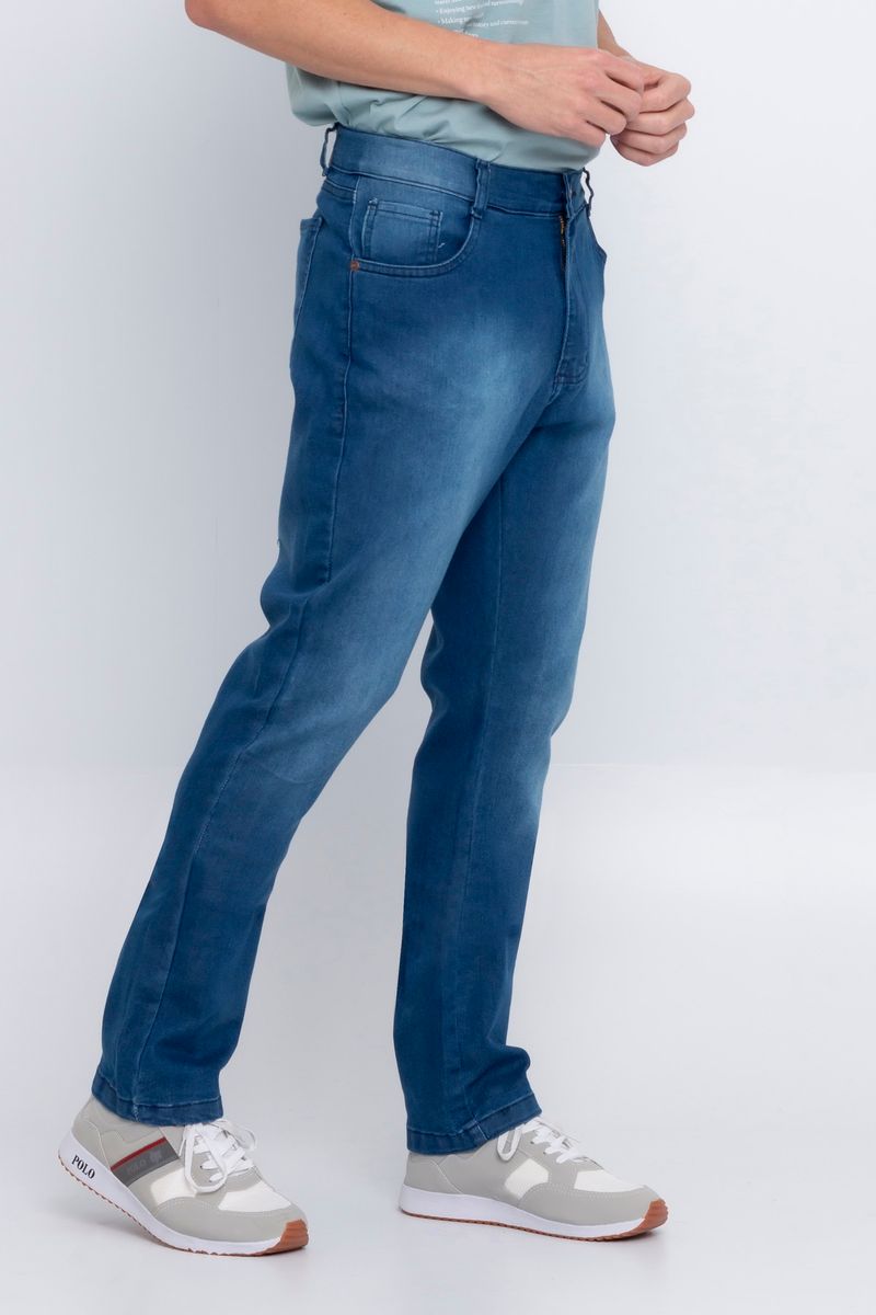 Calça masculina com modelagem slim, confeccionada em jeans. A peça possui fechamento por zíper e botão, bolsos frontais e traseiros.