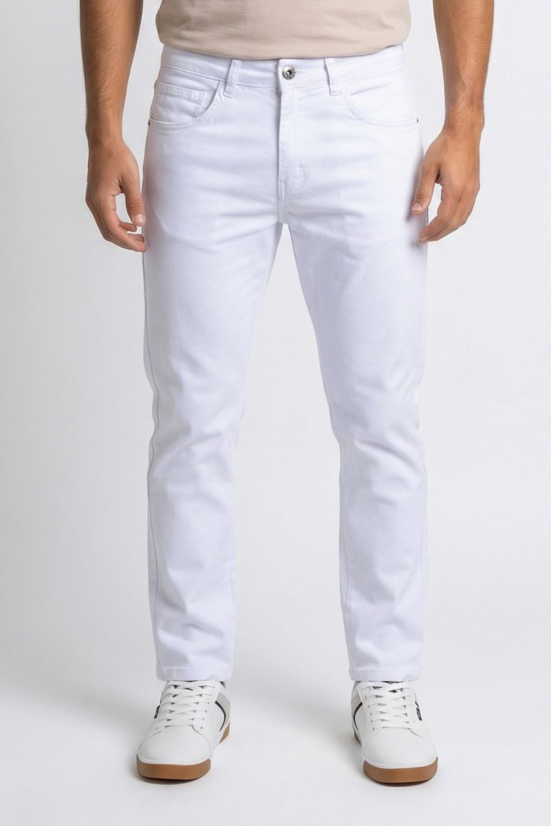 Eleve seu estilo com a Calça Jeans Masculina Branca Slim Fit Caedu. Confeccionada em sarja com elastano, oferece conforto e um caimento impecável. Uma peça essencial para quem busca roupas modernas e versáteis na moda masculina.