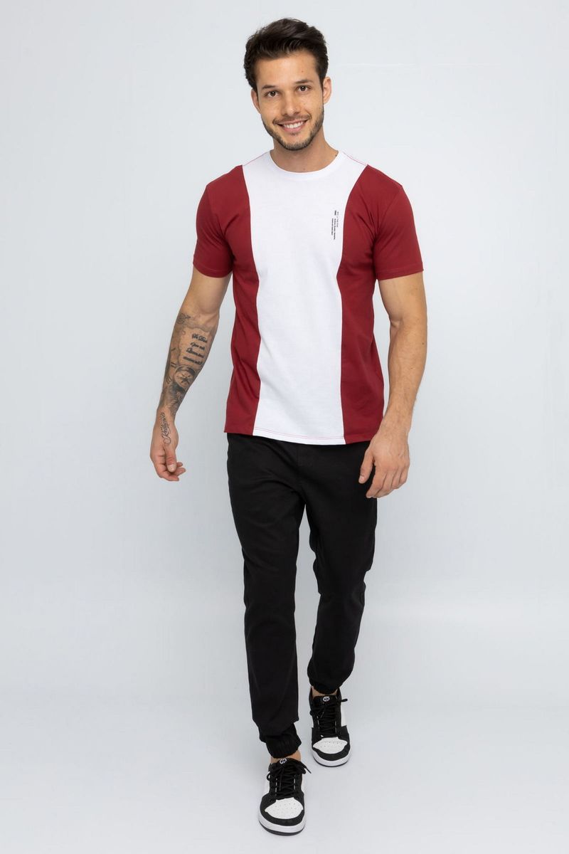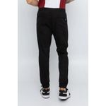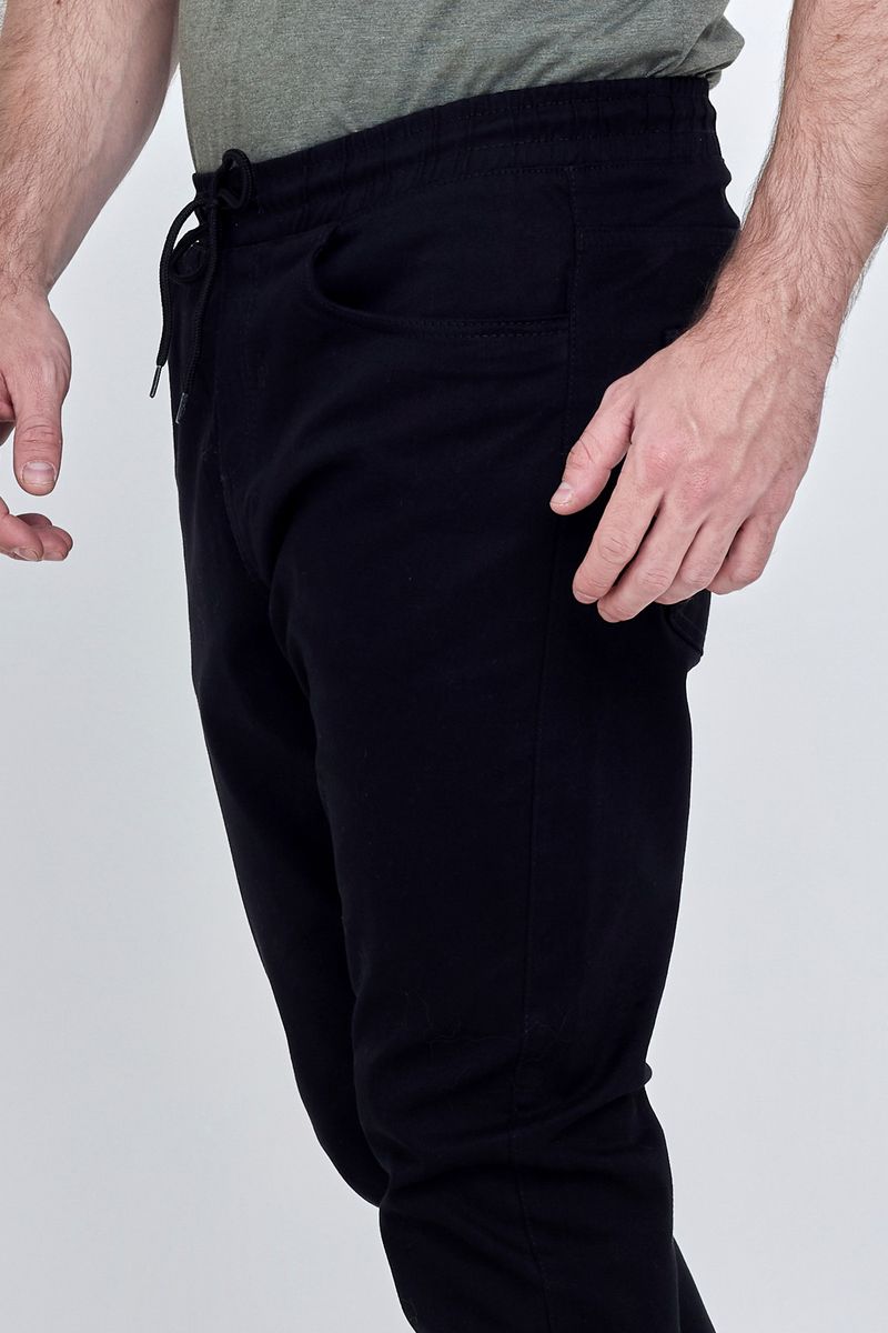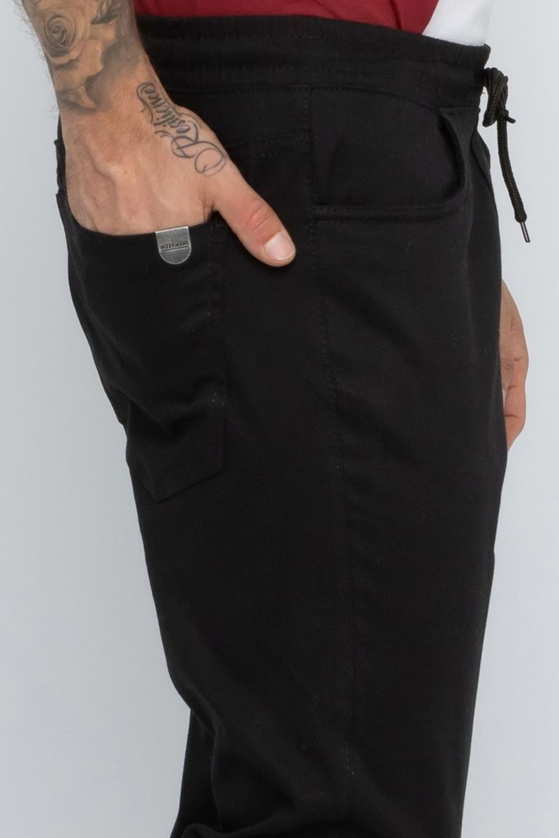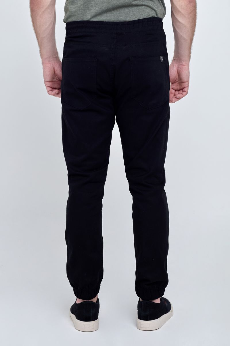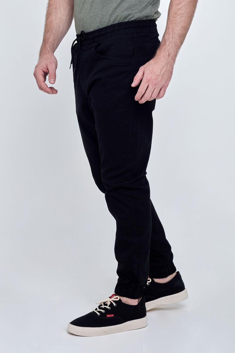 Calça masculina com modelagem jogger, confeccionada em tecido sarja. Possui bolsos e tiras para amarração no cós.