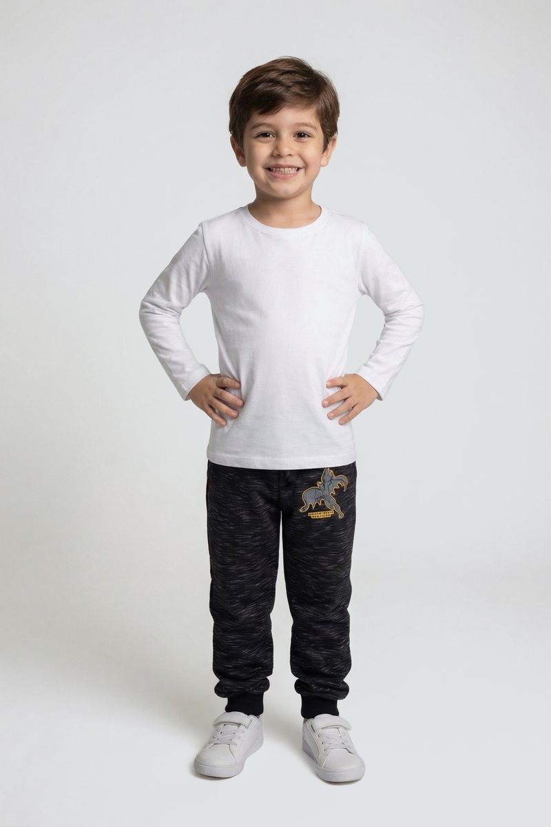 A Calça Moletom Jogger Infantil Mescla Preta com Estampa Batman da Caedu oferece conforto. Em moletom sem felpa, possui cós ajustável e punhos elásticos. A estampa do Batman garante um visual divertido e cheio de estilo.